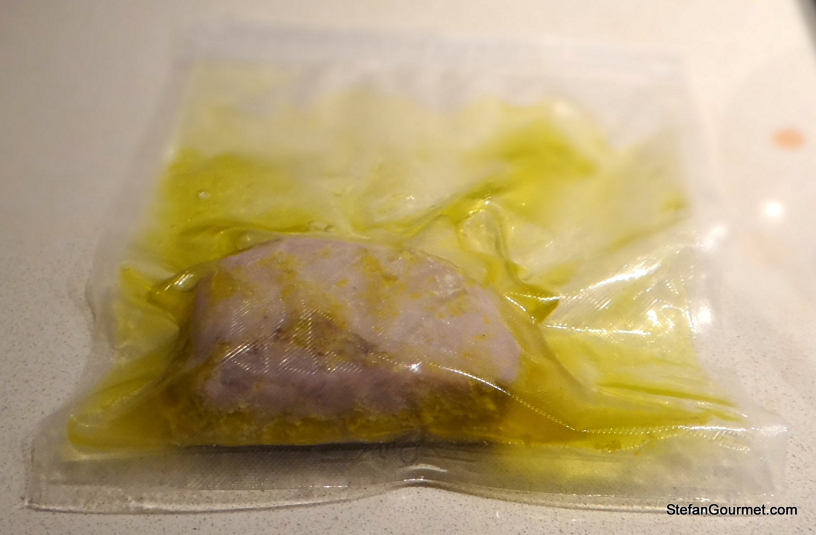 Canned tuna is cheap, but often of inferior quality. The tuna is dry and tastes mostly of salt. I have found good quality ‘organic’ canned tuna from the Ortiz brand, but that is more expensive than sashimi grade fresh tuna. So when I read about tuna cooked sous-vide with olive oil at 71ºC/160ºF for an hour as a tasty alternative for canned tuna on SVKitchen.com, my interest was piqued and I decided to give this a try. As the tuna will be pasteurized with this cooking time and temperature, it is perfectly fine to use frozen tuna for this that is a lot cheaper than sushi grade fresh tuna.