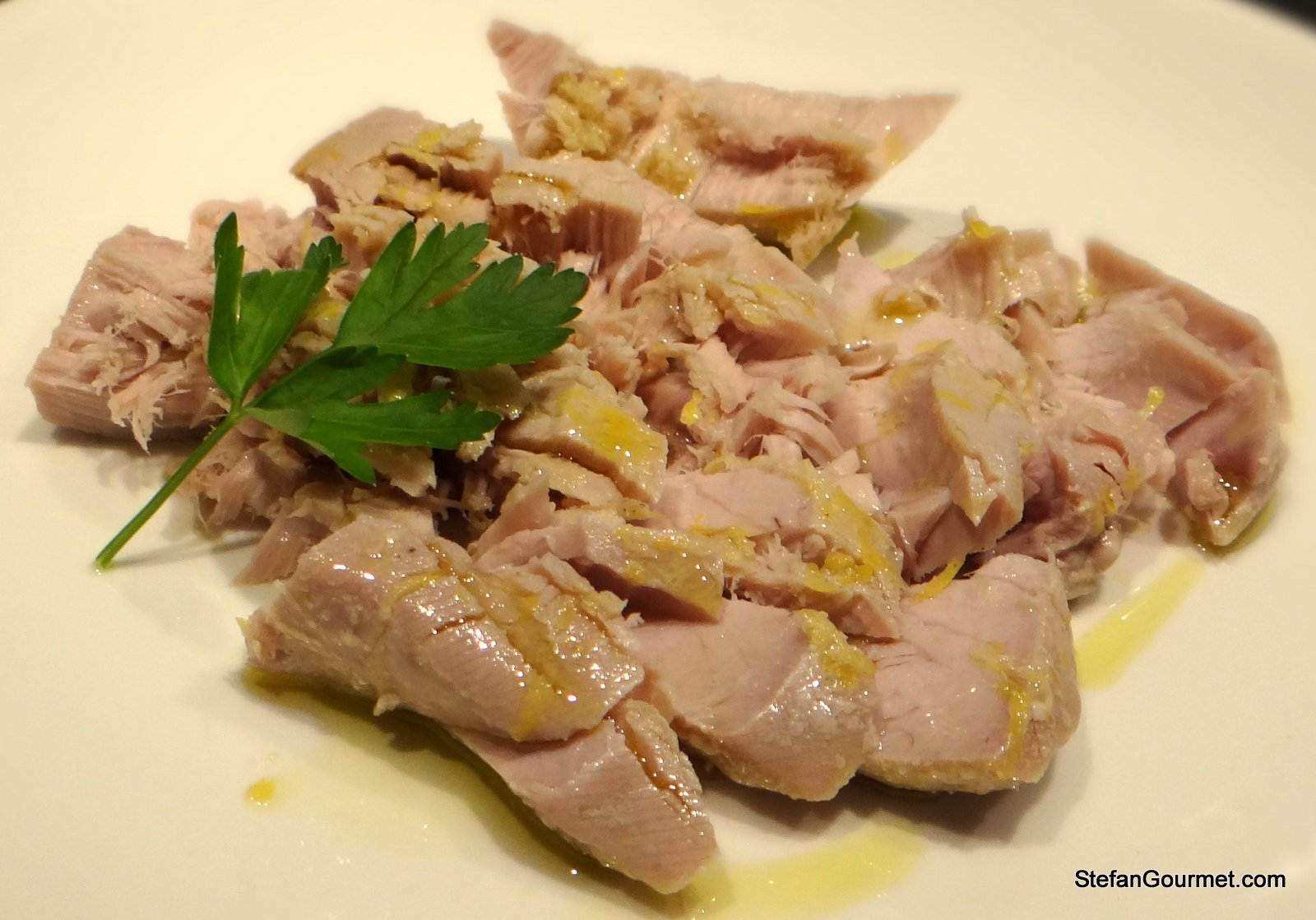 I was quite happy with the result. The cooking time and temperature will turn a piece of tuna into something that closely resembles canned tuna in texture and color, only more succulent and flavorful. The tuna will definitely be ‘well done’, not ‘medium rare’ at all as is usually the aim of sous-vide cooking. I prefer fresh tuna to be eaten raw or only seared, but this is certainly a good alternative for canned tuna if that is called for in a recipe. Especially in recipes where the tuna stands out (such as a Niçoise salad), it is worth using sous-vide tuna confit rather than canned tuna. I haven’t tried this side by side, but from memory I’d say it’s also better than Ortiz.