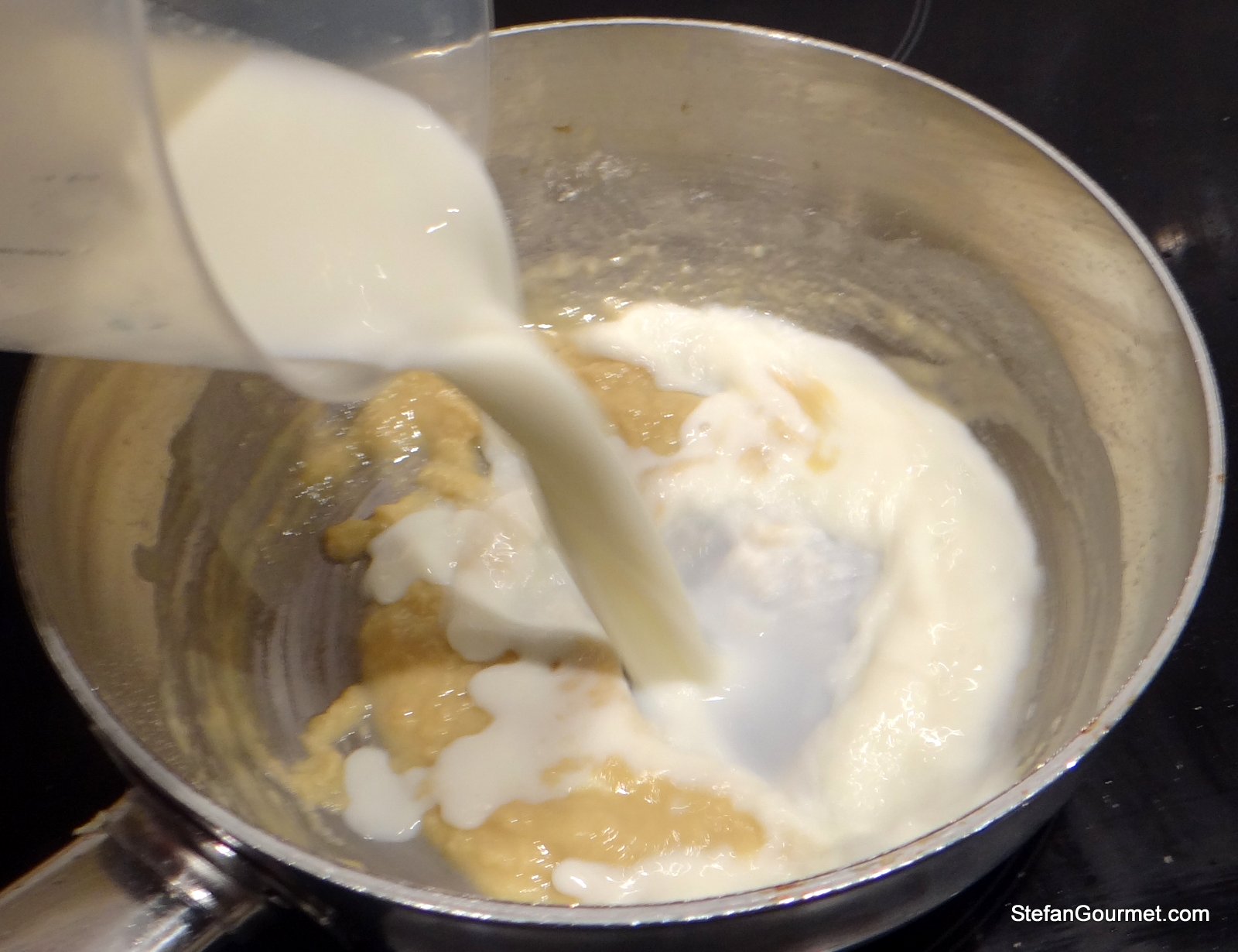 Make a bechamel sauce by melting the butter, adding the flour, adding warm milk (heated in the microwave), whisking energetically to avoid lumps, and then cooking over medium heat, stirring, until the sauce thickens.