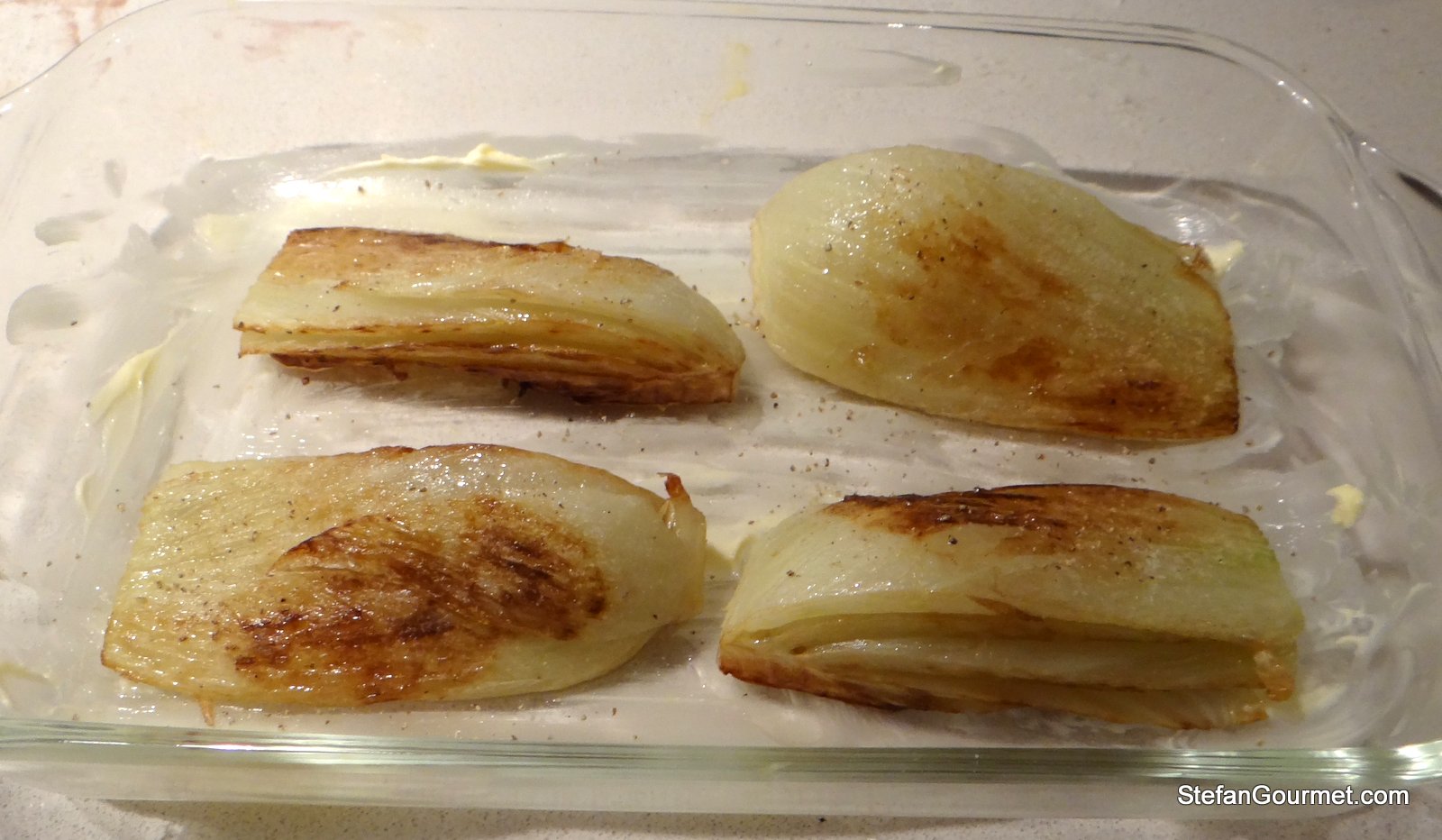 Parboil the fennel in salted boiling water for 10 minutes and then plunge them in cold water to stop the cooking.