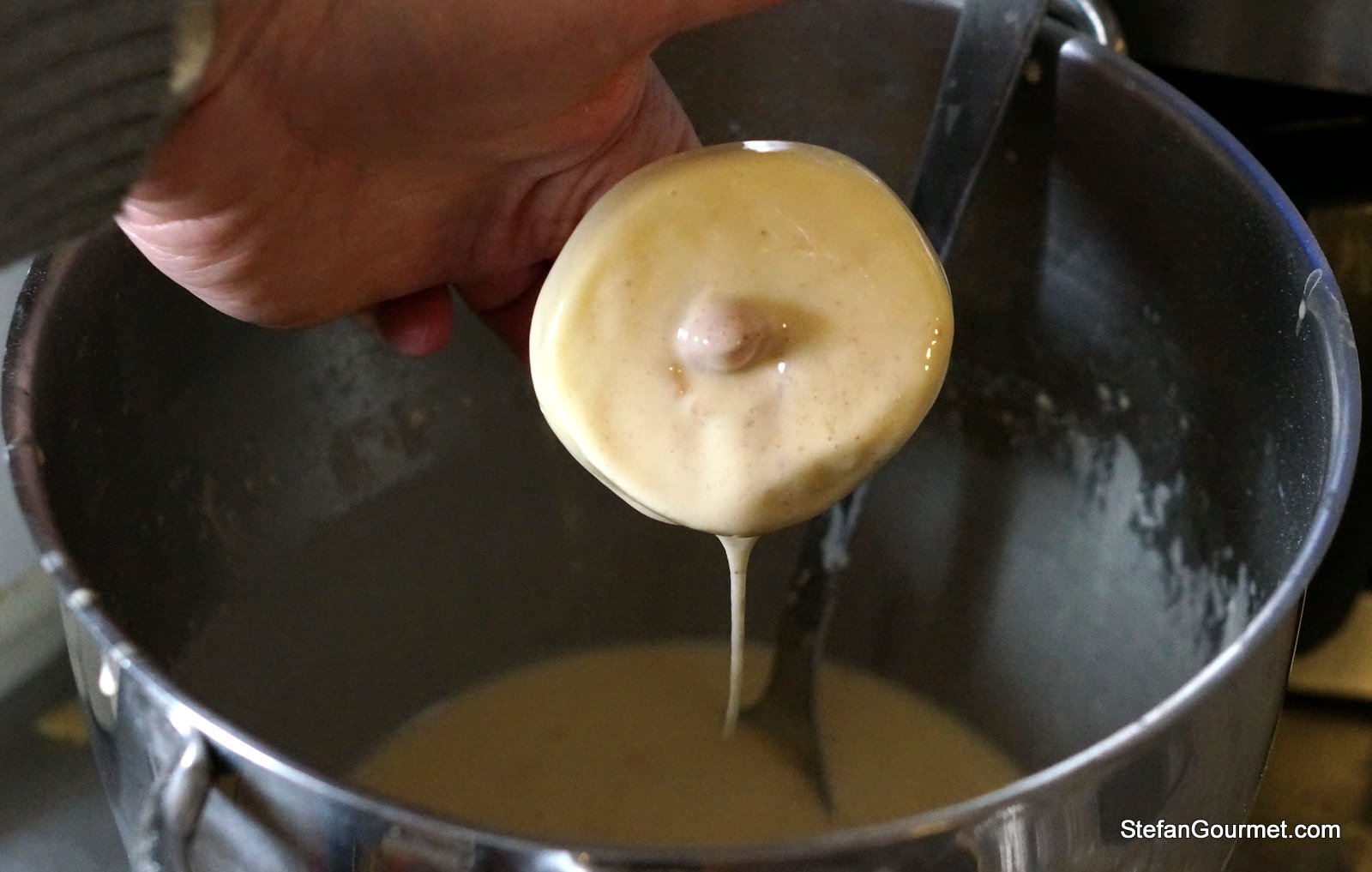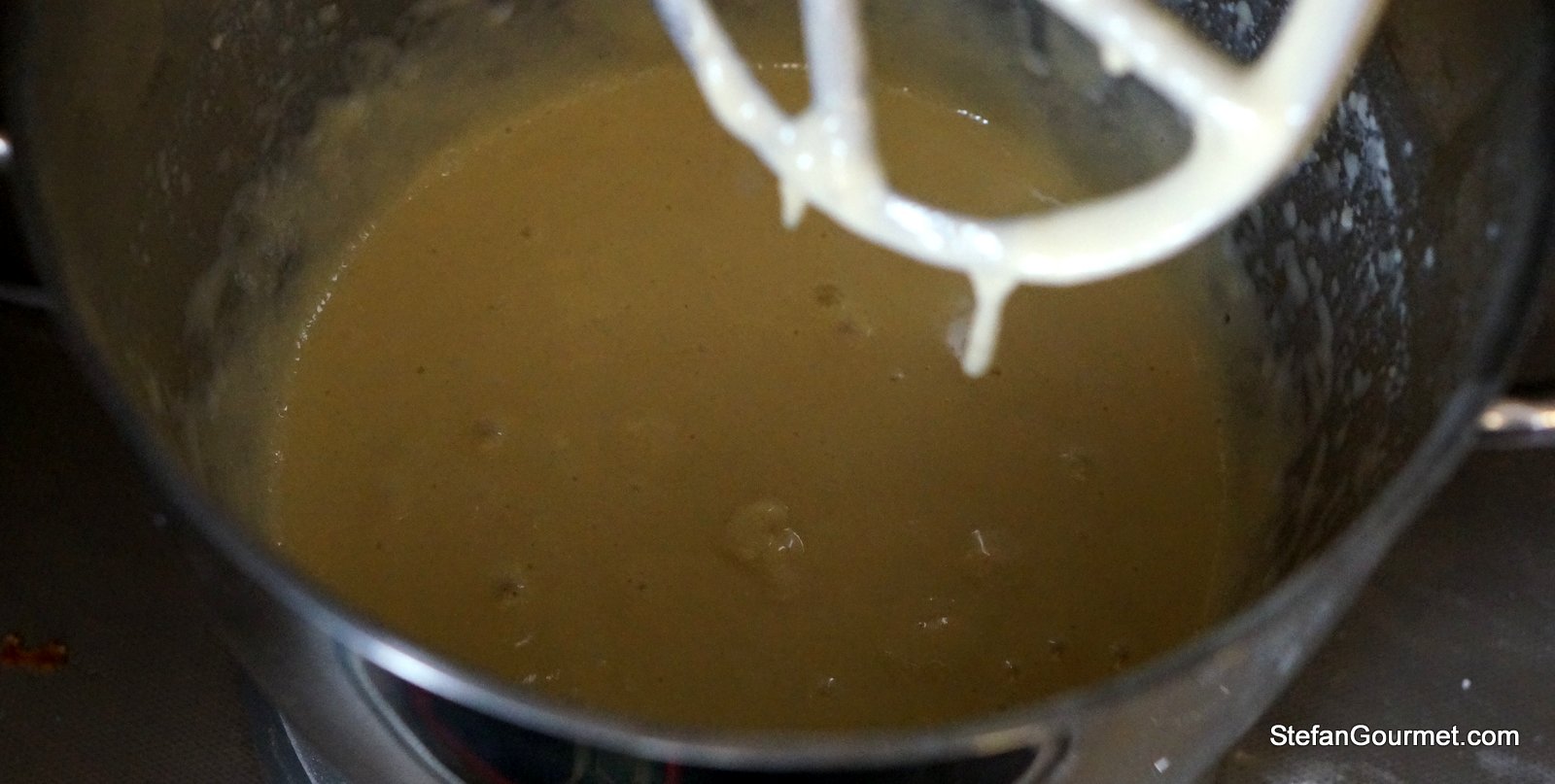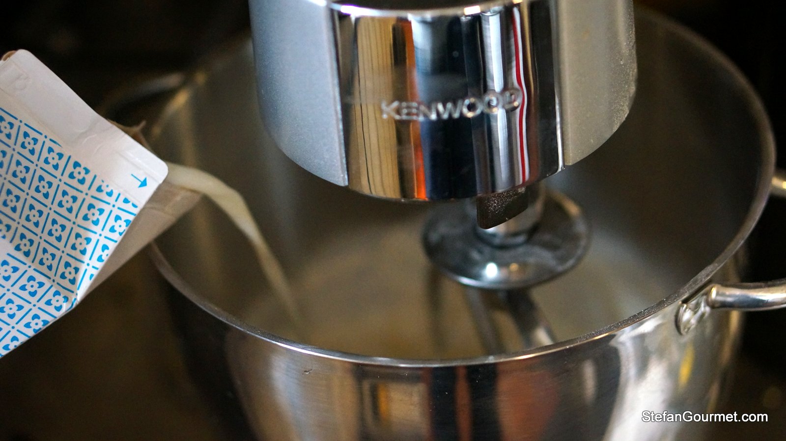 You can prepare the batter with a whisk just like for pancakes, but in this case I used a stand mixer because that is what I brought to the New Year’s Party. Put the sifted flour in the bowl of the stand mixer together with a pinch of salt and 2 Tbsp of sugar. Turn on the machine and slowly add the milk and eggs.