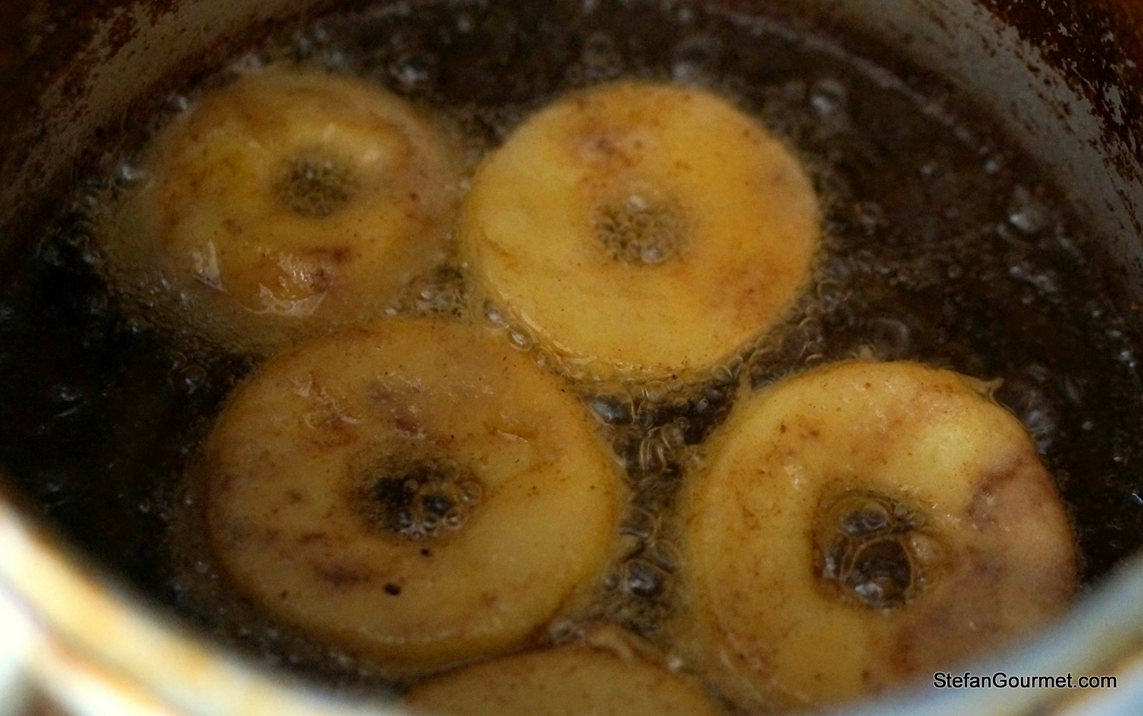 Make sure the apple slice is covered with batter on all sides and lower it into the oil. Deep fry until golden brown on both sides, turning after a few minutes.