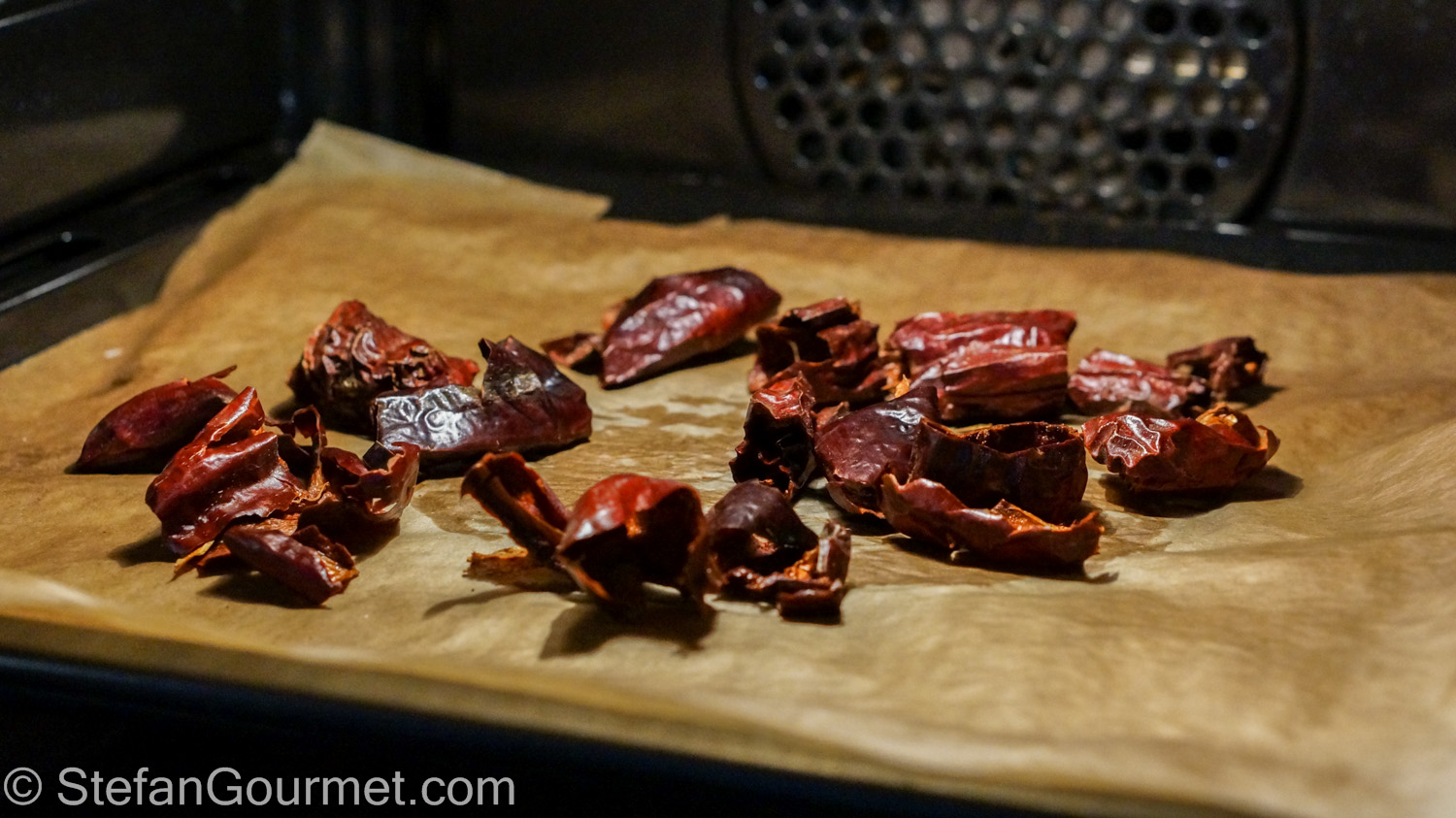 Stem and seed the chiles. The weight of chiles after seeding and stemming should be about 18 grams or .6 oz. The official way is to toast them in a skillet, but I prefer to do this in the oven for 5 minutes or so at 150ºC/300ºF.