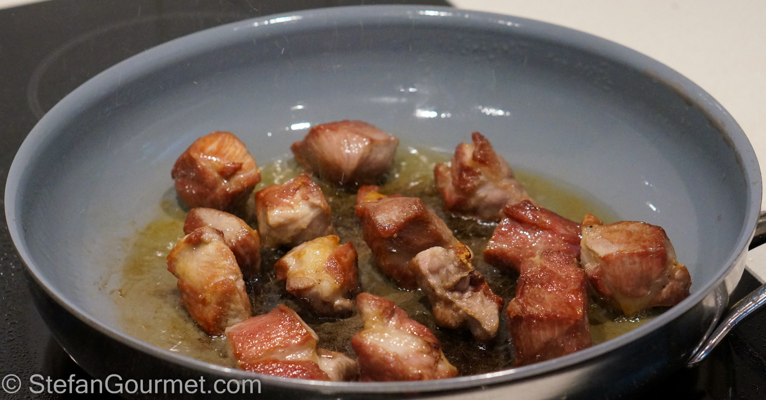 Heat the pork fat in a frying pan and brown the pork over high heat on all sides.