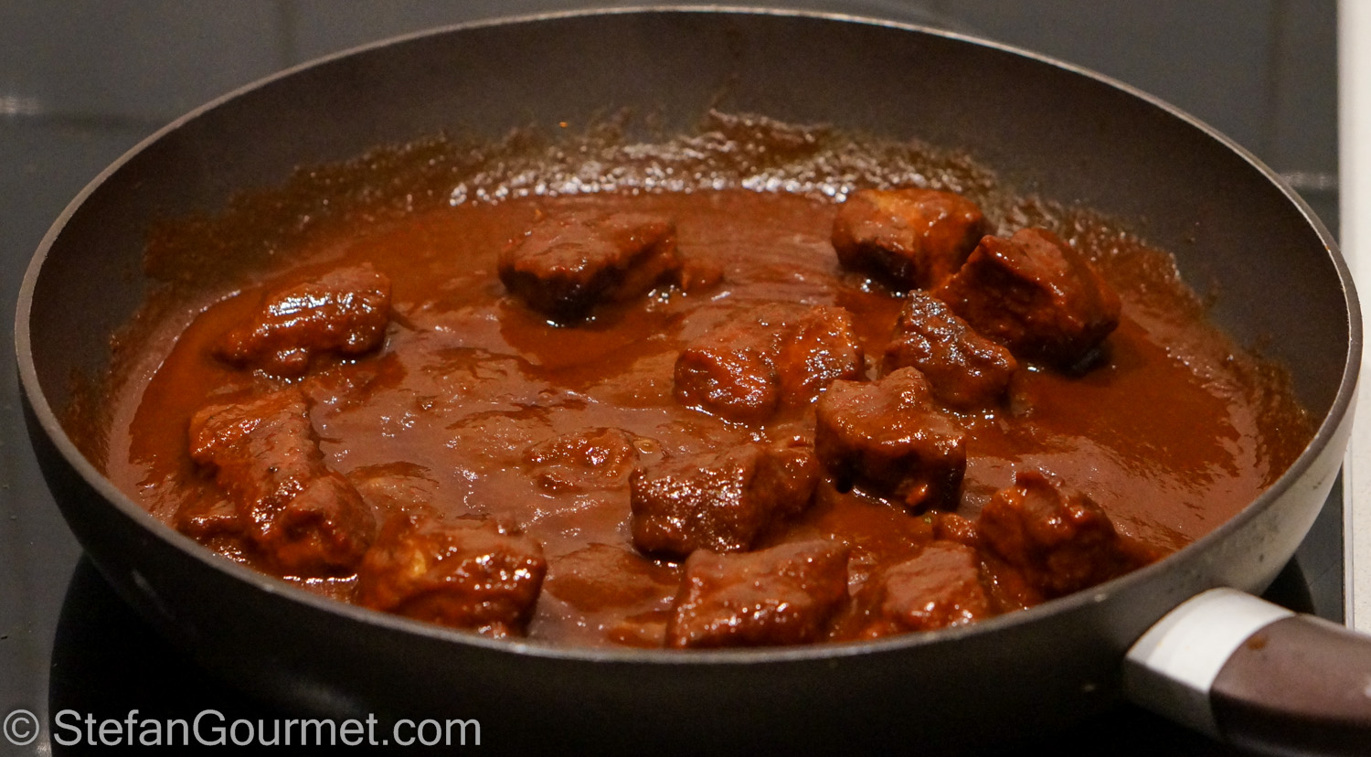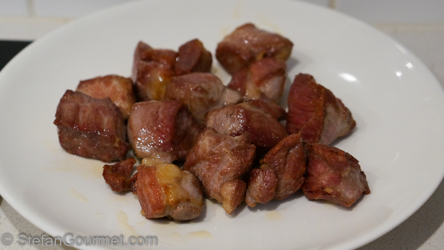 Remember that the meat is only  57ºC/135ºF, so for serving it is better to heat it up for a few minutes over medium heat in a non-stick frying pan, stirring.