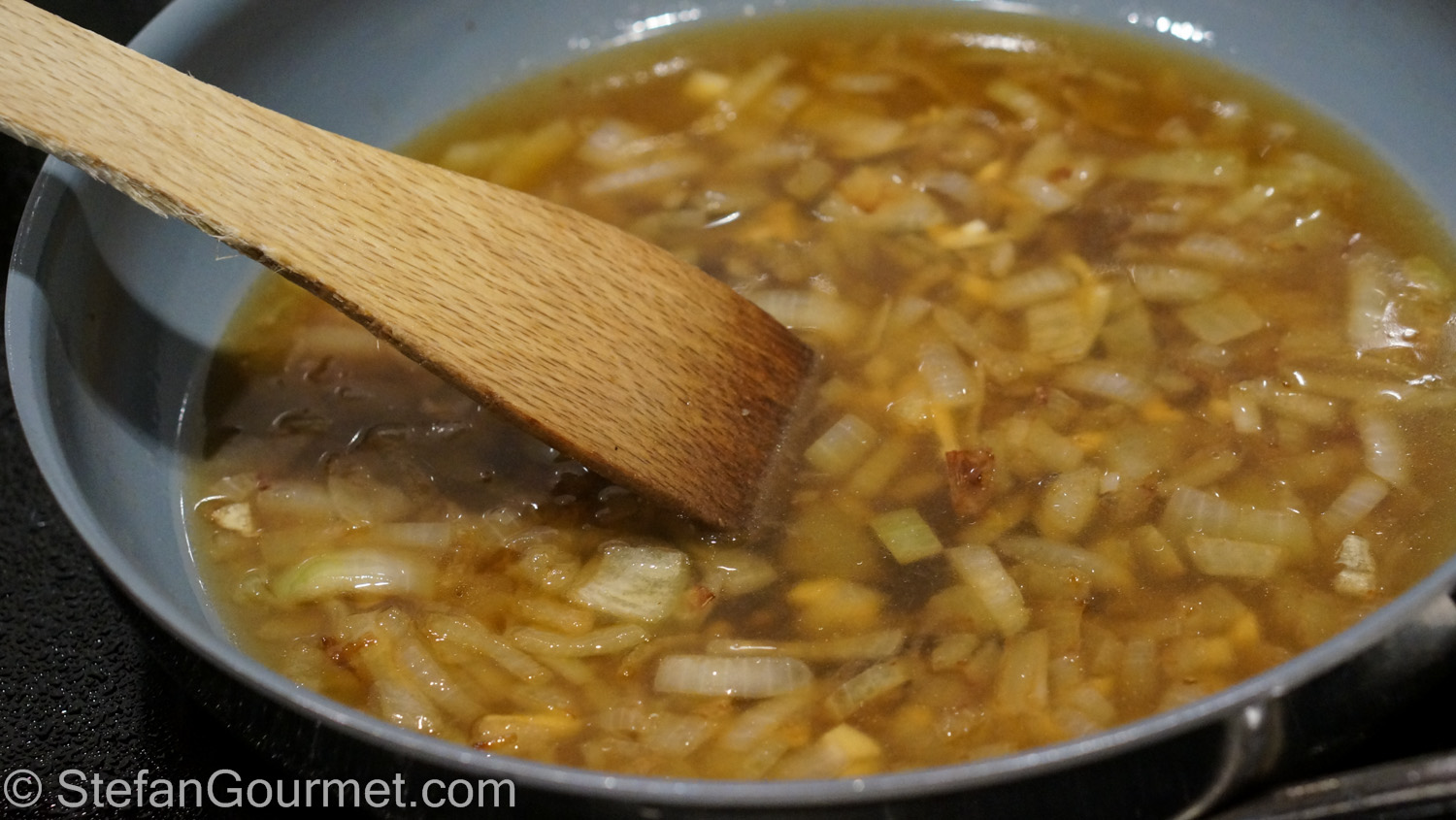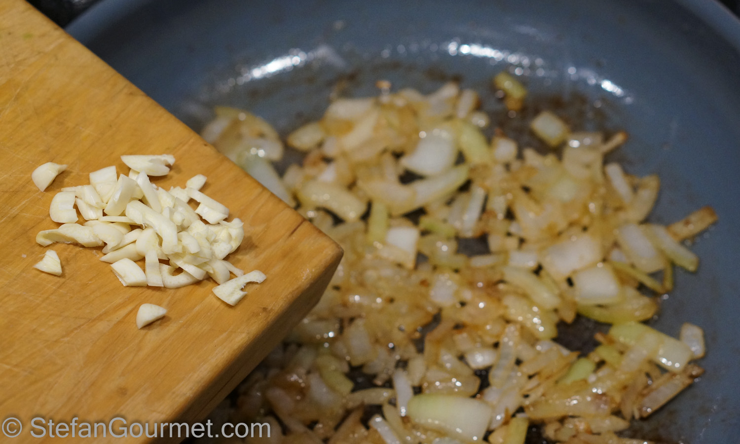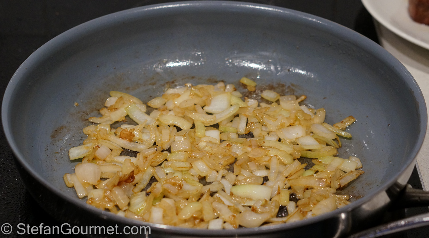 Add the onion to the remaining pork fat and sauté over medium heat until slightly golden.