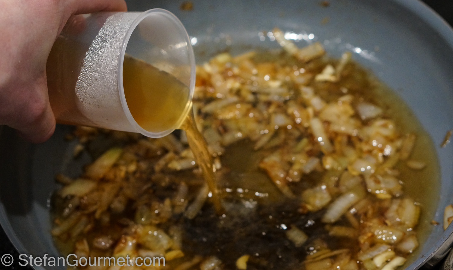 Scrape all the browned bits off the bottom with a wooden spatula.