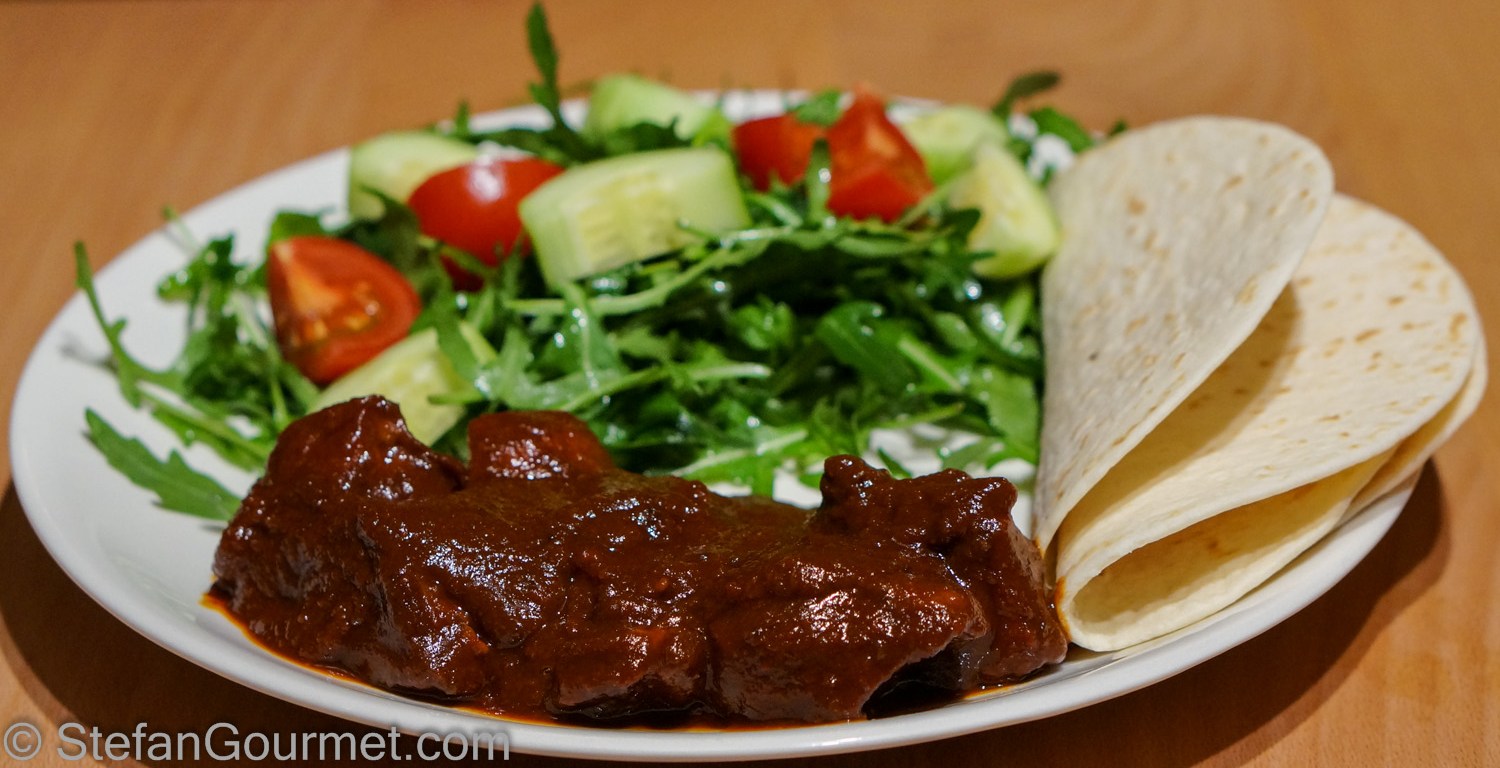 It was no surprise at all that the first recipe of 2014 on REMCooks.com was a chile recipe. This pork dish from New Mexico seemed fairly straightforward and delicious, and I thought it would be nice to tweak it just a little and use pork stock and cook the pork sous-vide. Pork shoulder is cooked in a sauce of dried chiles and spices. The first time I made the mistake of cooking it along with a smoked ham hock in the same sous-vide water bath, which imparted an unpleasant bitter aftertaste to the dish. I made it again and then it turned out delicious. Thanks, Richard!