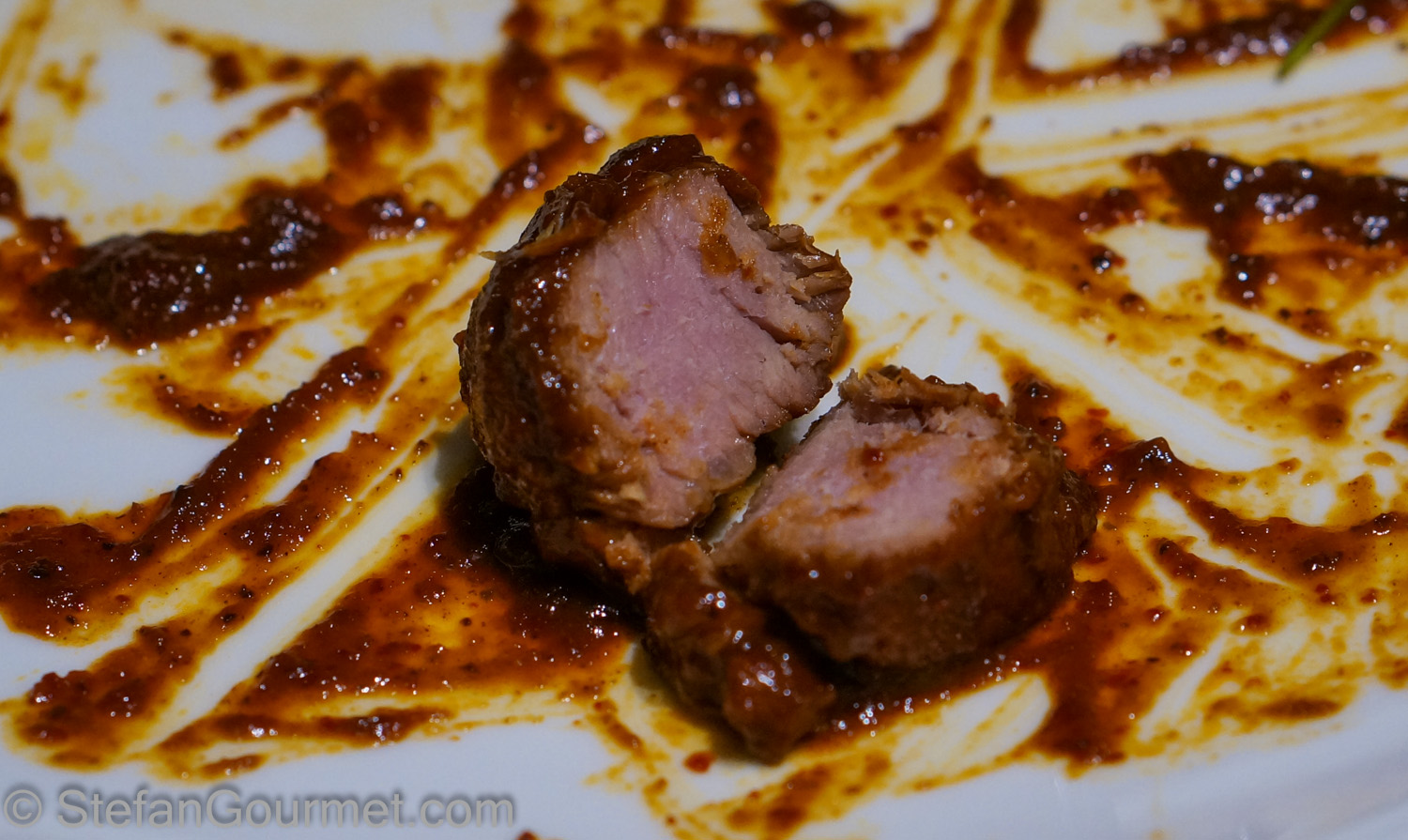 There are two advantages to preparing this sous-vide. The first is that you can prepare it on a rainy Sunday afternoon, stick it in the sous-vide cooker and then forget about it until dinner time on Tuesday. Then you only need to open the bag and serve. The second is that the pork will be more tender and juicy than you can imagine. After 48 hours at 57ºC/135ºF the pork is thoroughly pasteurized and absolutely safe to eat, even though it looks pink.
