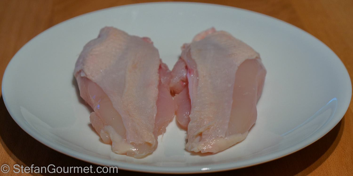 I started with the breast of a free range chicken. Both halves came from the same chicken, so it is a fair experiment.