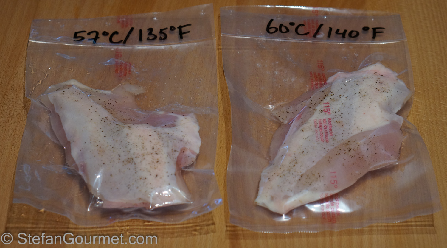 It was not easy to see the difference, but it was possible to taste it. Both were tender and juicy. The 57ºC/135ºF chicken breast was slightly less tender but slightly more juicy. The 60ºC/140ºF chicken breast was slightly less juicy but slightly more tender.