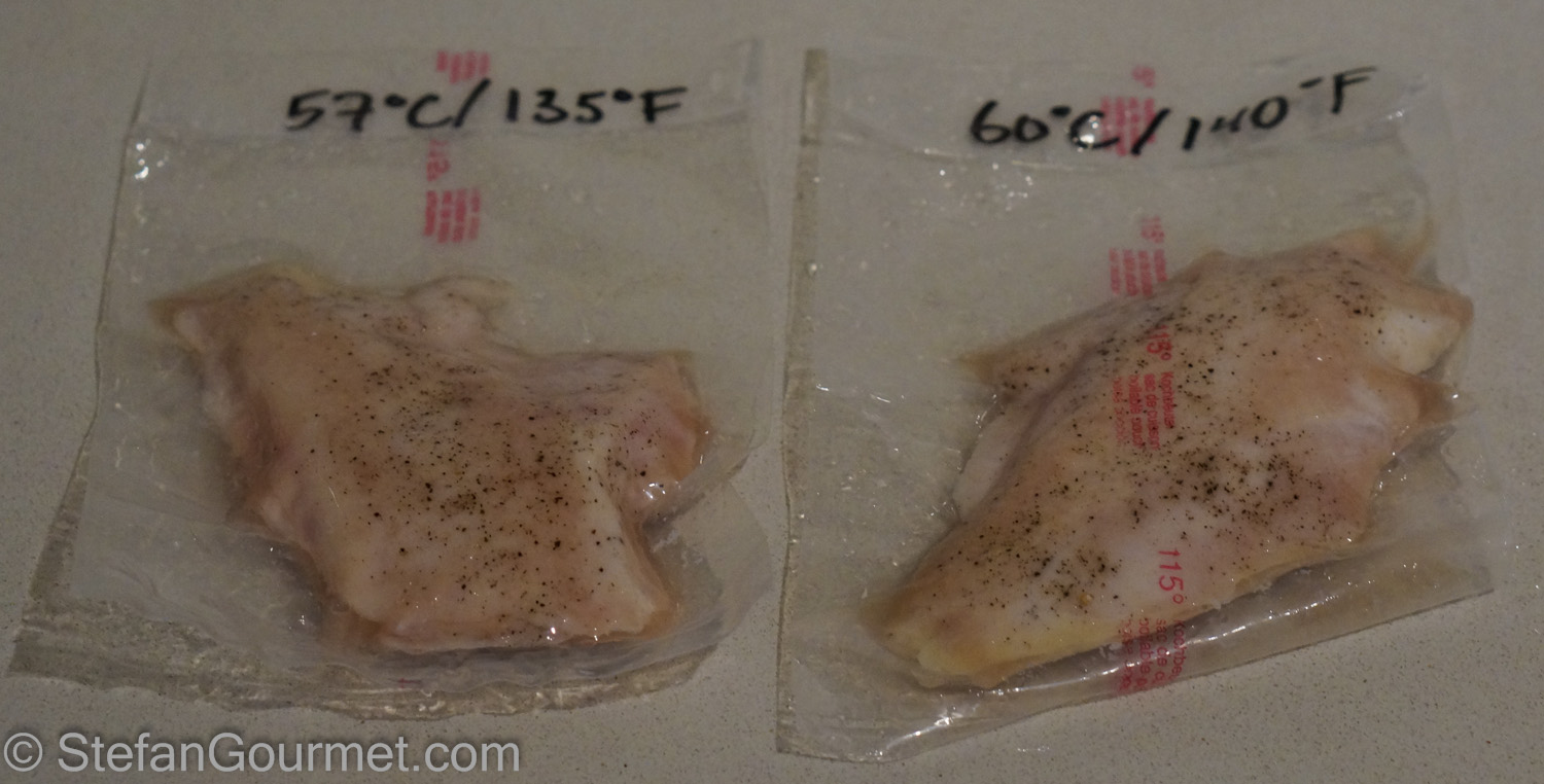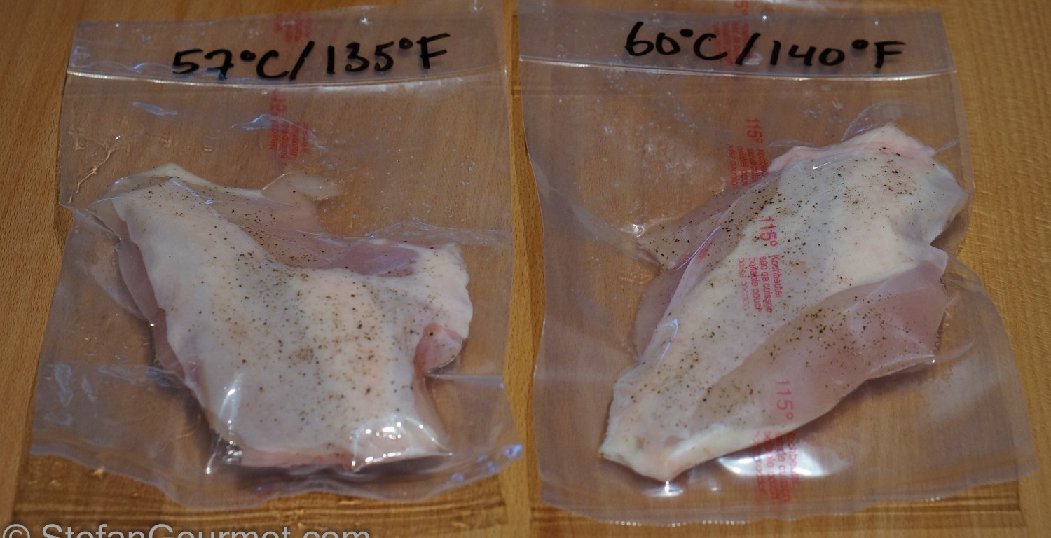 1. That’s really interesting, Stefan! So, you are also a scientist. I wonder why the 135•F was more juicy? The most complex way I prepare chicken is to roast a whole one… and here you are using two different sous vide methods and also searing… 🙂