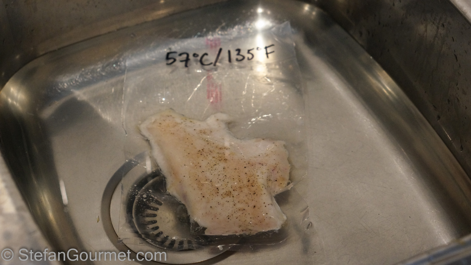 Then I quickly chilled it in (ice) cold water and refrigerated it, while the sous-vide cooker heated up to 60ºC/140ºF for the other chicken breast.