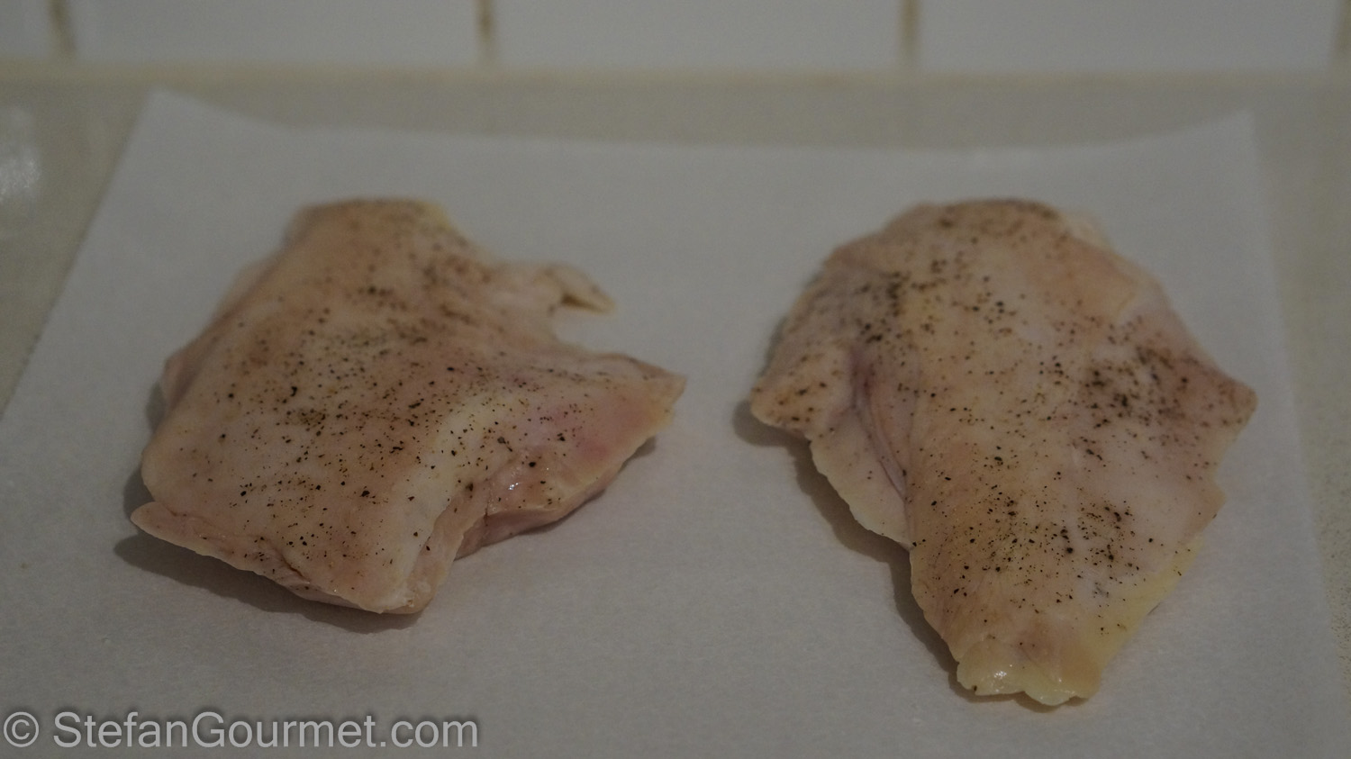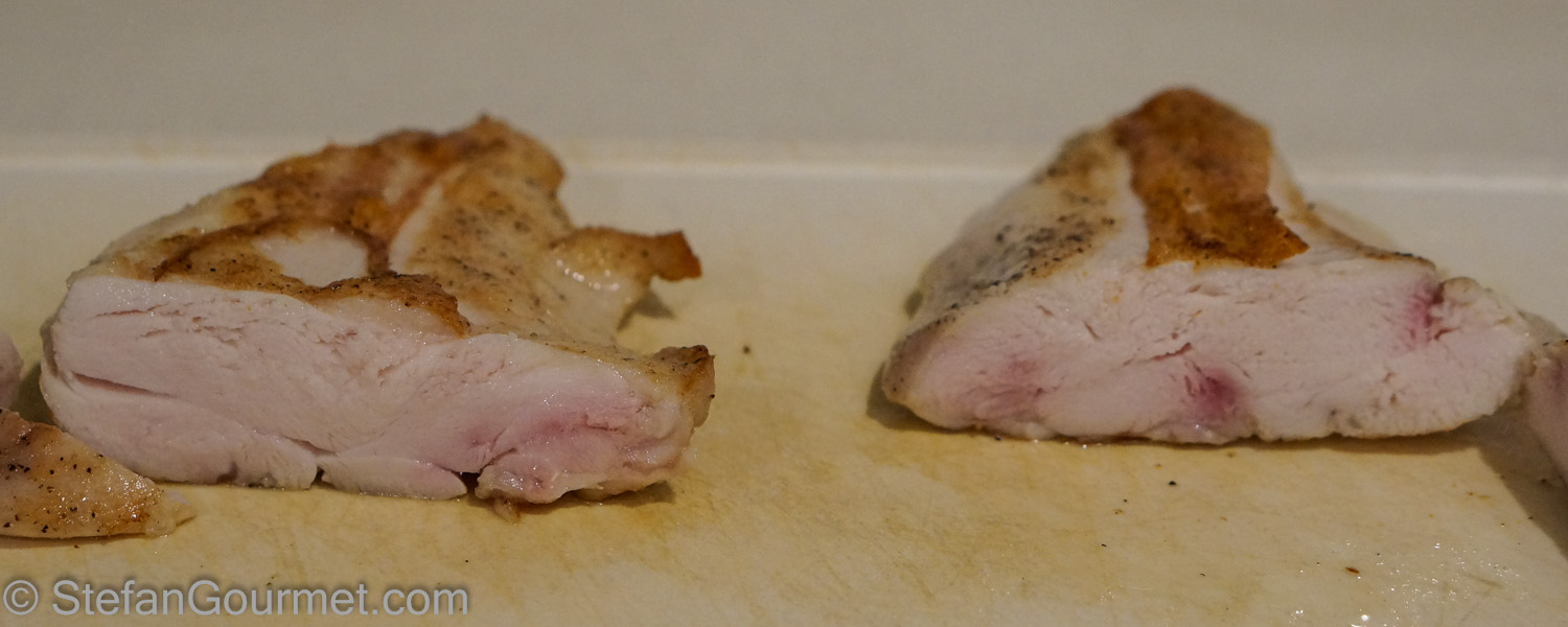 It’s been a while since I’ve done my last sous-vide temperature experiment. There is one I have been wondering about, and that is chicken breast. I don’t prepare chicken breast often, because I think chicken thighs have better flavor and are less prone to becoming dry. I prefer to cook most meat ‘medium rare’ whenever possible, and for chicken breast that would be cooked to a temperature of 57ºC/135ºF. This is what I have been using, but most other recipes I’ve seen for chicken breast sous-vide, including Modernist Cuisine, use a temperature of 60ºC/140ºF instead. This is what I would call ‘medium’ for chicken breast. Modernist Cuisine states they prefer the texture. And so it was time for another side by side experiment.