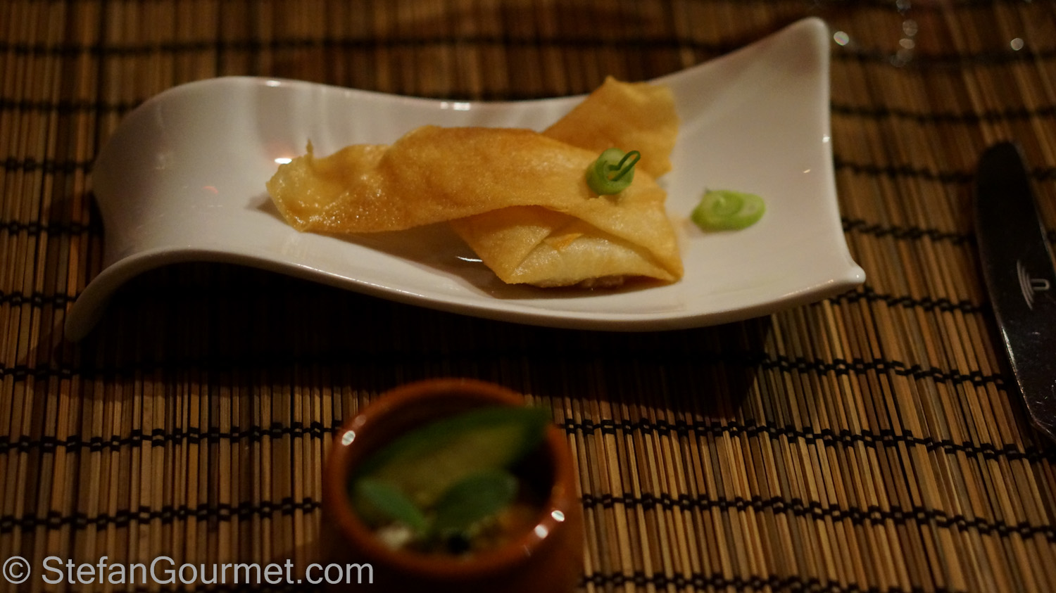 Nieuwe Niedorp is a small village ‘in the middle of nowhere’, less than an hour north of Amsterdam in the province of North Holland. Who would have known that there is such a nice restaurant out there, Red Chilli. They call themselves “Modern Asian cuisine”, and it seems to be a fusion between Chinese, Japanese, Korean, Vietnamese and Thai with some western influences thrown in. Besides à la carte there are degustation menus of 3, 4, 5, 6 or 7 courses. We opted for the 7-course “Prestige” menu (89.50 euros) with matching wines (56 euros). Very convenient for such an out-of-the-way location is the designated driver wine pairing (7 half glasses for 29.50 euros).