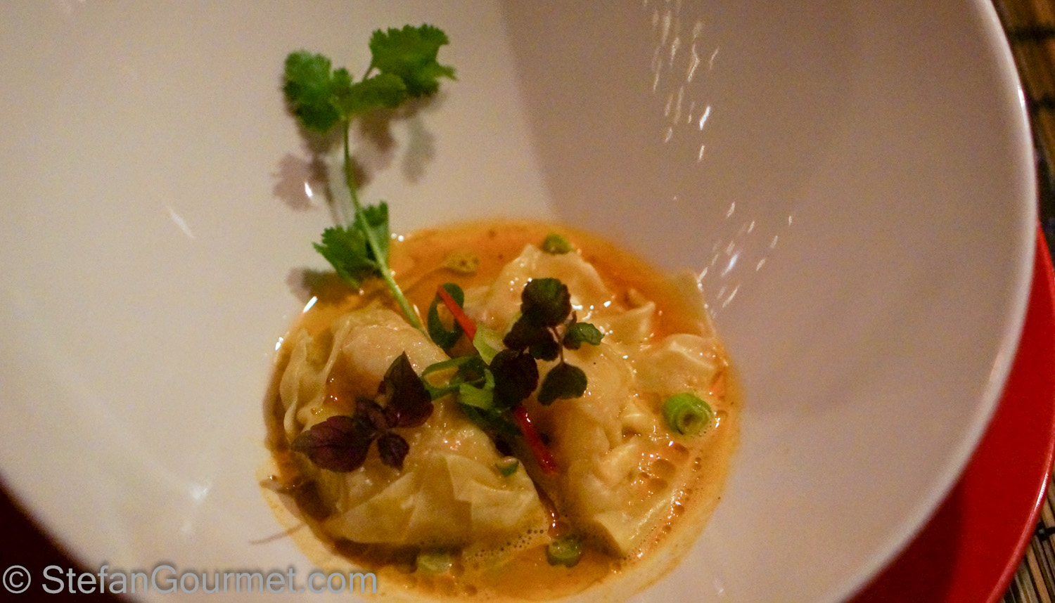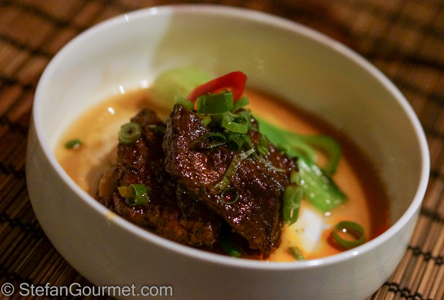 USA “grain fed” beef with green curry. More beef, and I liked this one better than the previous. Especially with the fresh noodles. It was paired nicely with a California cabernet. 9/10