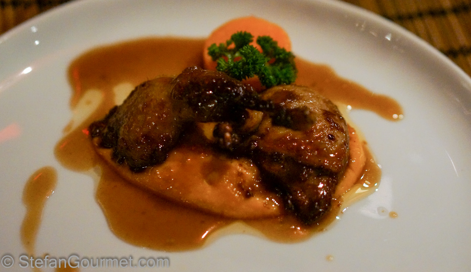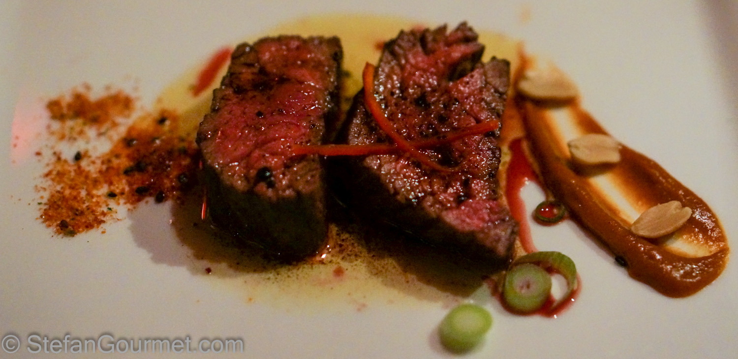 These king prawn ravioli (raviolli’s on the menu) with a sauce of coconut milk, lemon grass and king prawn reduction, was absolutely wonderful. The king prawns were perfectly cooked with a nice bite to them. Excellent wine pairing with an oaked white merlot from Switzerland. The coconut milk worked very well with the buttery vanilla notes of the wine. 10/10