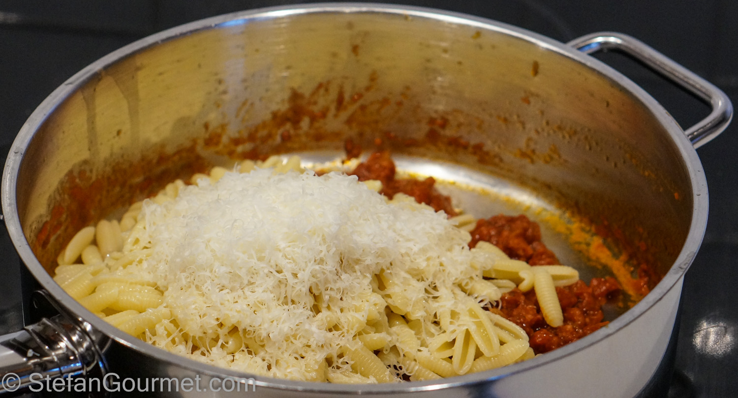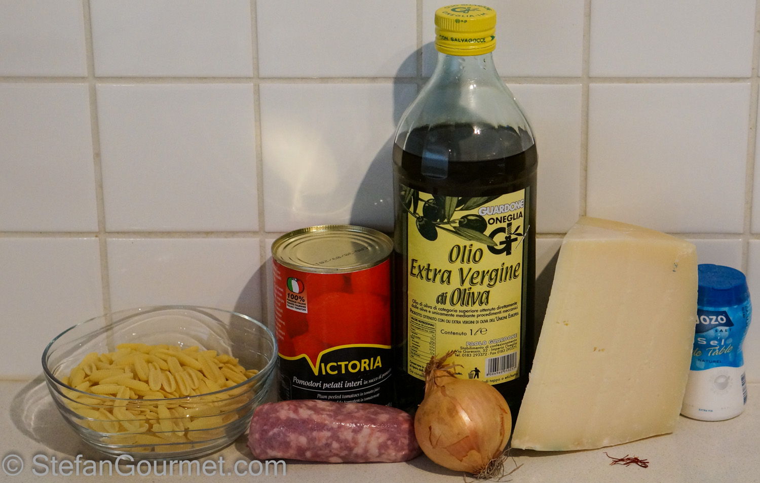 Each region in Italy has its own pasta shapes and pasta recipes. For the southern part of the island of Sardinia the shape is called malloreddus or gnocchetti sardi, and the traditional dish using them is called Malloreddus alla Campidanese. A while ago I showed you how to make fresh malloreddus from scratch, with an amazingly delicious sauce of fennel and sausage. This time I used store-bought dry malloreddus and prepared them traditionally alla Campidanese. This means with (Sardinian) pork sausage, tomatoes, onions, and saffron. It goes without saying that the cheese to be sprinkled over this should be pecorino sardo (sheep’s cheese from Sardinia), which happens to be one of my favorite cheeses.