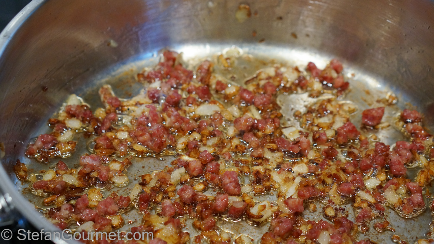 Sauté over medium heat until sausage and onion are golden, about 10 minutes. (I was living on the edge here, as the onions were almost too brown.)