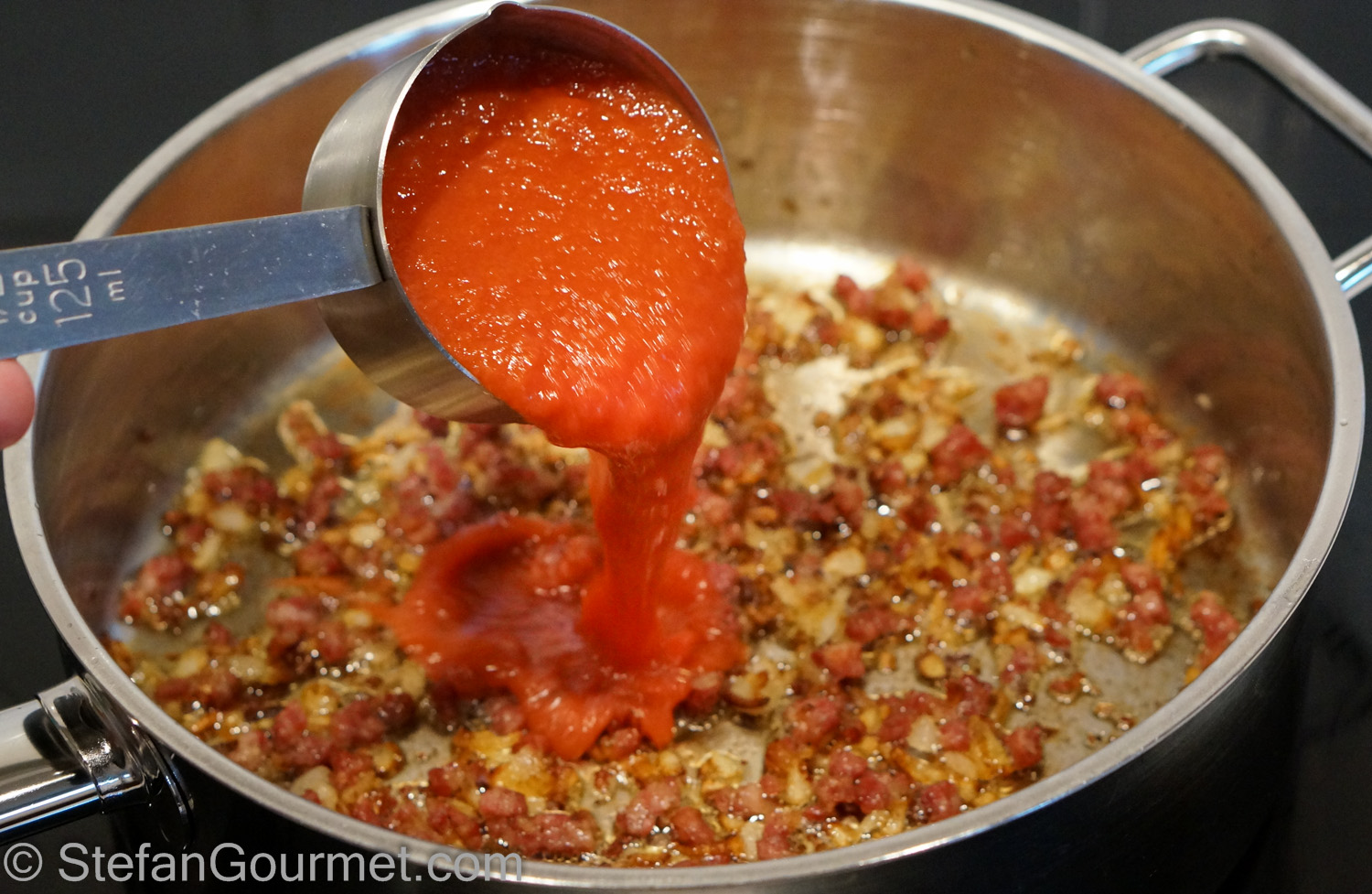 DeCecco makes gnocchetti sardi, which makes them relatively easy to find outside of Sardinia. Artisanal or homemade malloreddus are of course better, but I liked this dish just fine with DeCecco. Using store-bought pasta makes this a dish that is easy to prepare after work on a weeknight, as it takes only half an hour from start to finish. This dish is best with fresh ripe Sardinian tomatoes, but canned tomatoes will do in a pinch. The amount of sauce is small, just enough to coat the pasta, which is as it should be. This does mean that this is a true primo piatto that should be followed by a secondo piatto to make it a full meal, as the amount of protein and especially vegetables would otherwise not be sufficient.