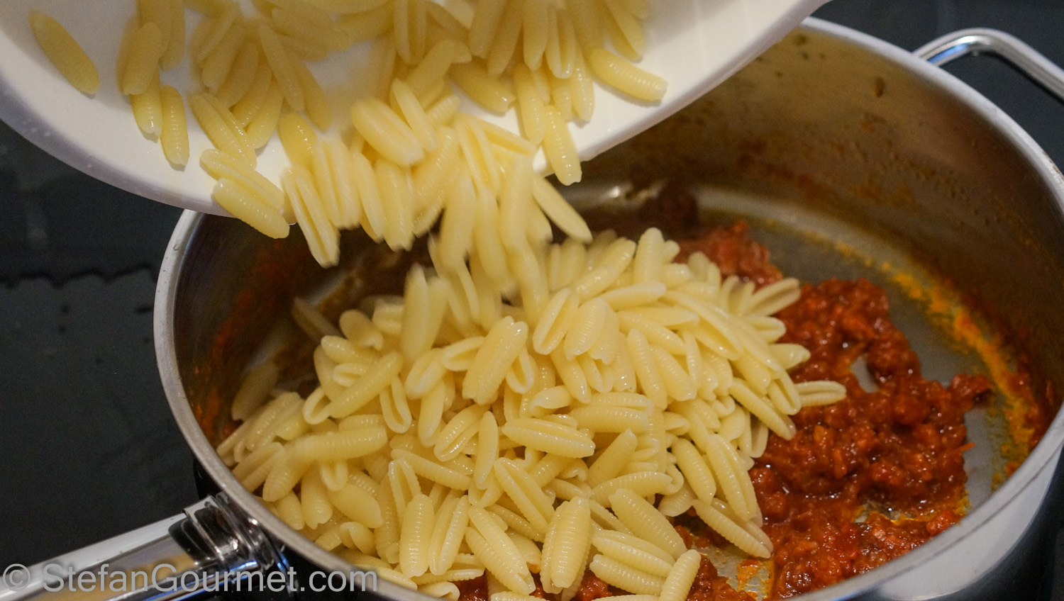 Meanwhile, bring a pot of water to a boil and add salt and malloreddus. Cook the malloreddus al dente according to package instructions.
