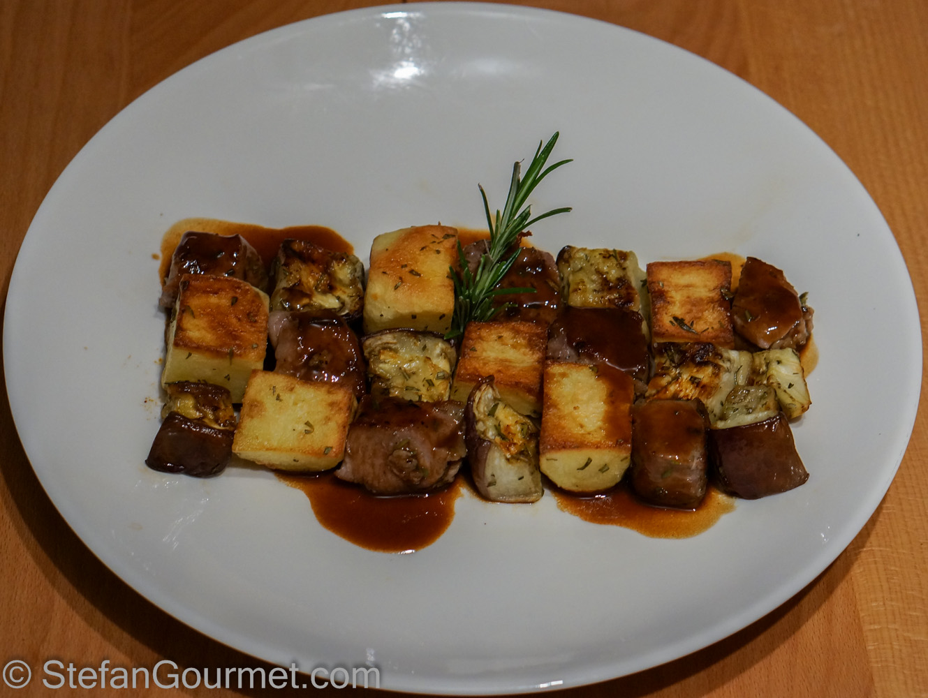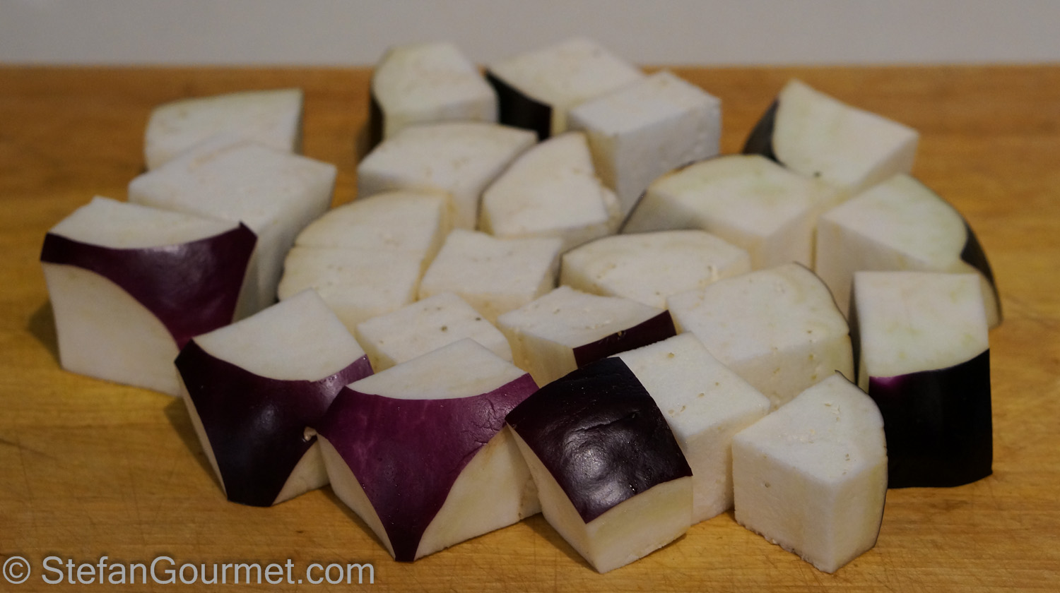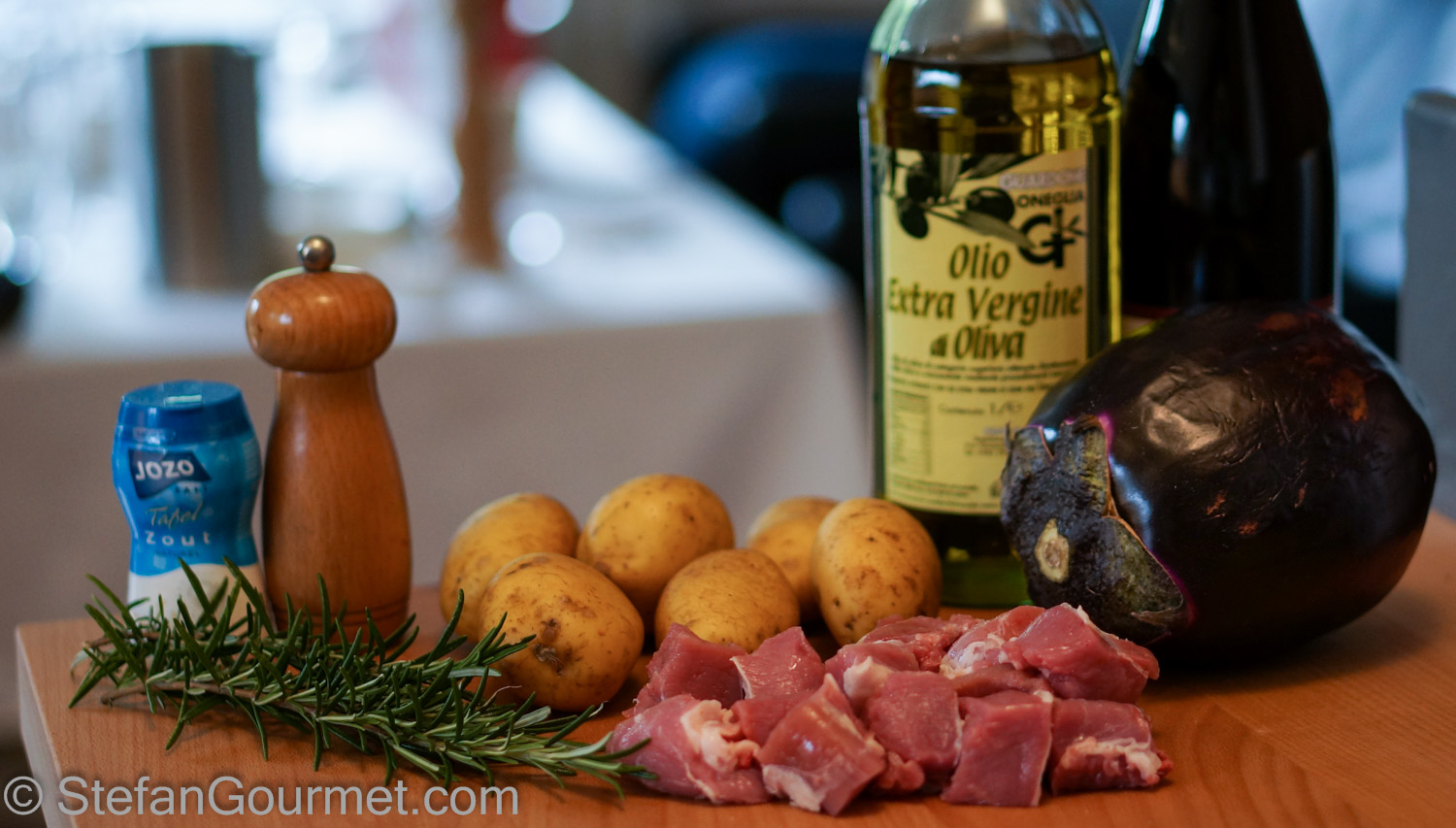 Usually I am a substance over form kind of guy, but this time around I went for the look — without forgetting about flavor of course! The flavors in this dish are a classic combination: lamb, rosemary, eggplant, and potato. I decided to cut all ingredients into cubes of roughly equal size, and serve the dish as a mosaic. I don’t like wasting food so the cubes are not as perfect as they would be in a Michelin starred restaurant. This is a nice dish to impress your friends as the ‘wow factor’ is in the presentation and the preparation is otherwise pretty straightforward.