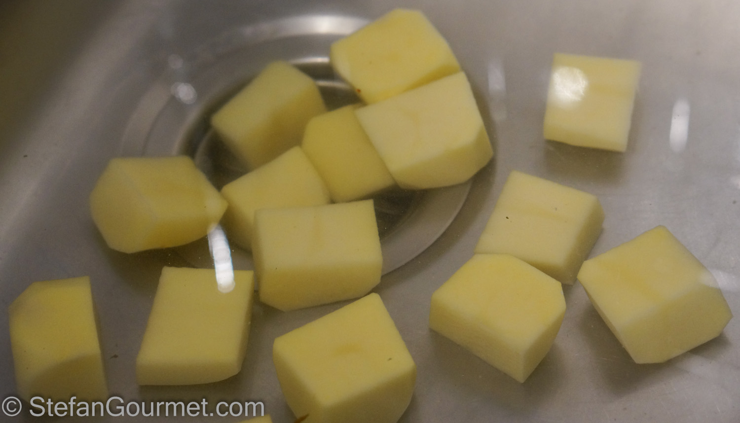 Peel the potatoes and cut them into cubes. Soak in cold water to remove excess starch.
