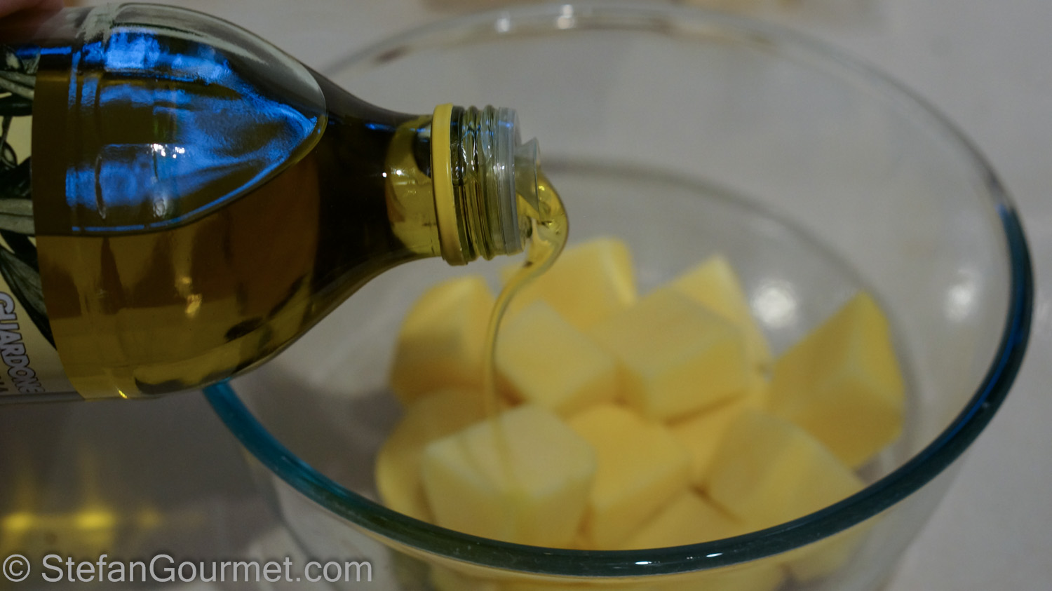 Pat the potatoes dry and add a bit of olive oil as well as 1/2 Tbsp rosemary. Toss to coat.