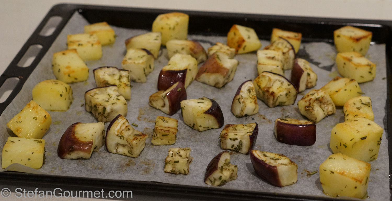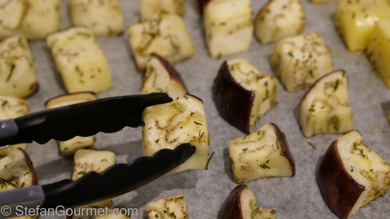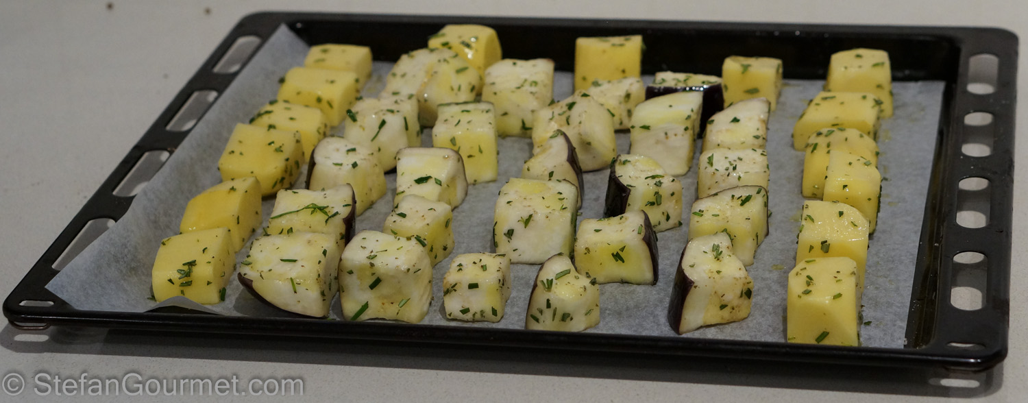 Roast the potatoes and eggplant in the oven at 225ºC/440ºF for 20 minutes. Then turn all the cubes around.