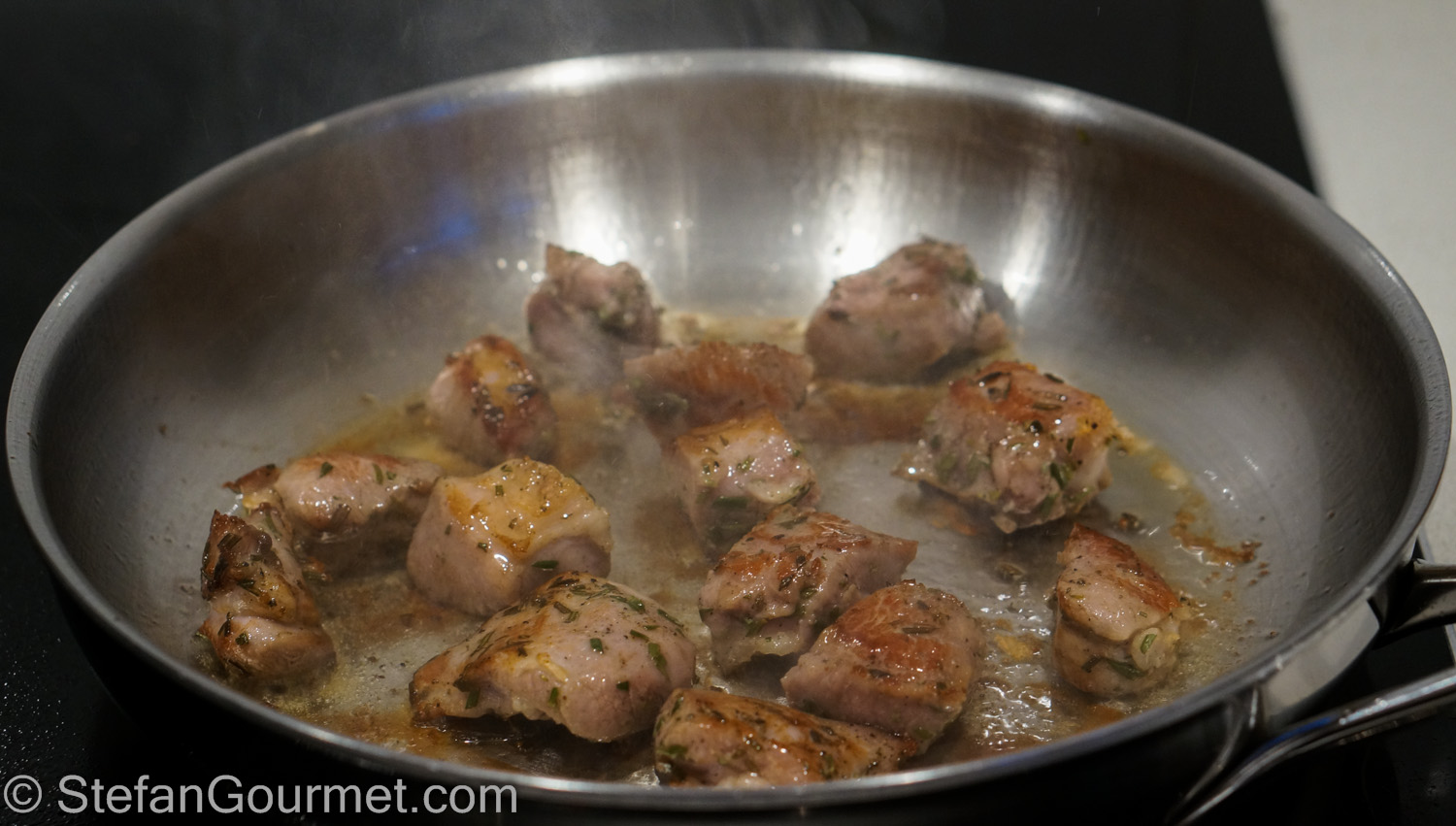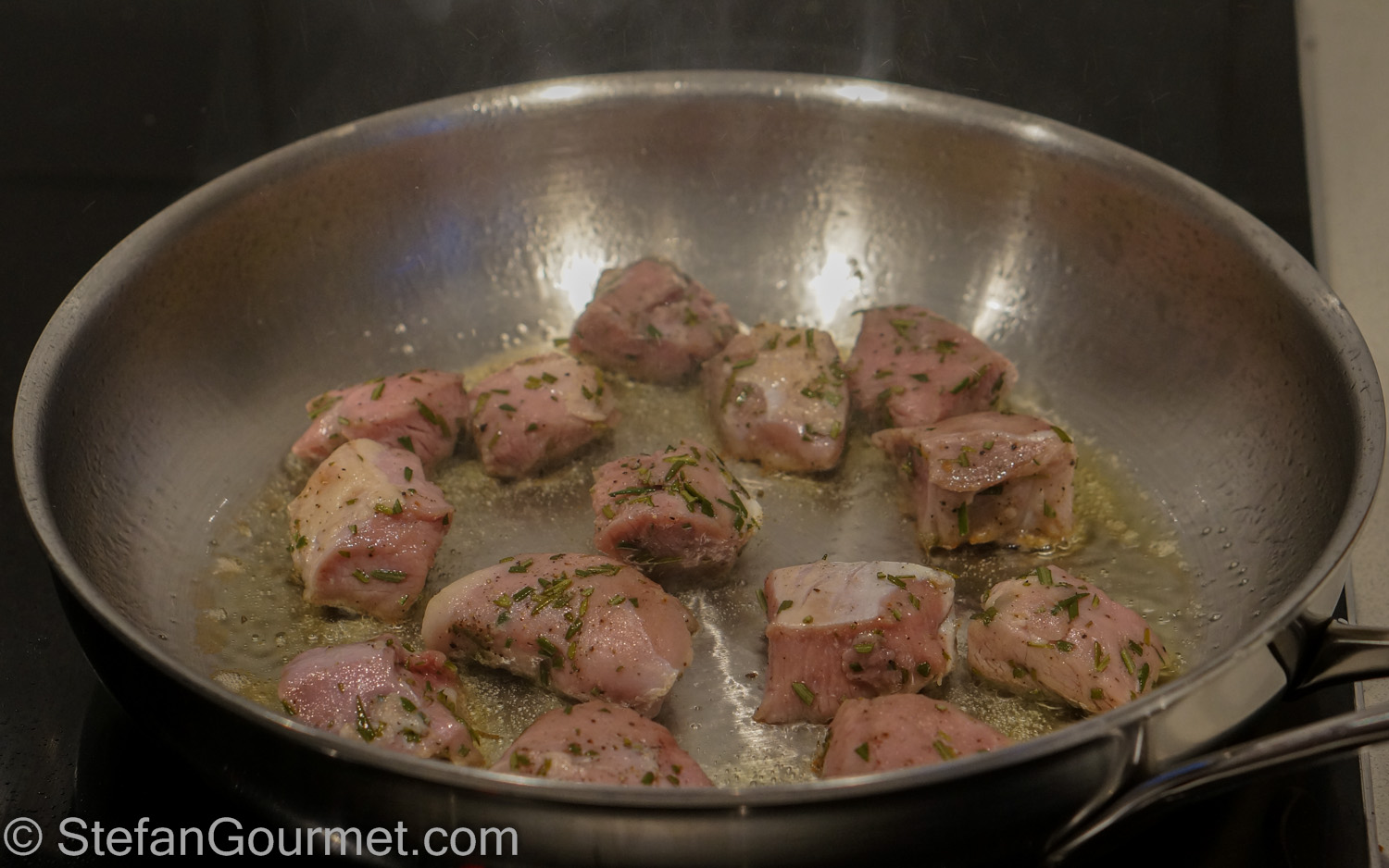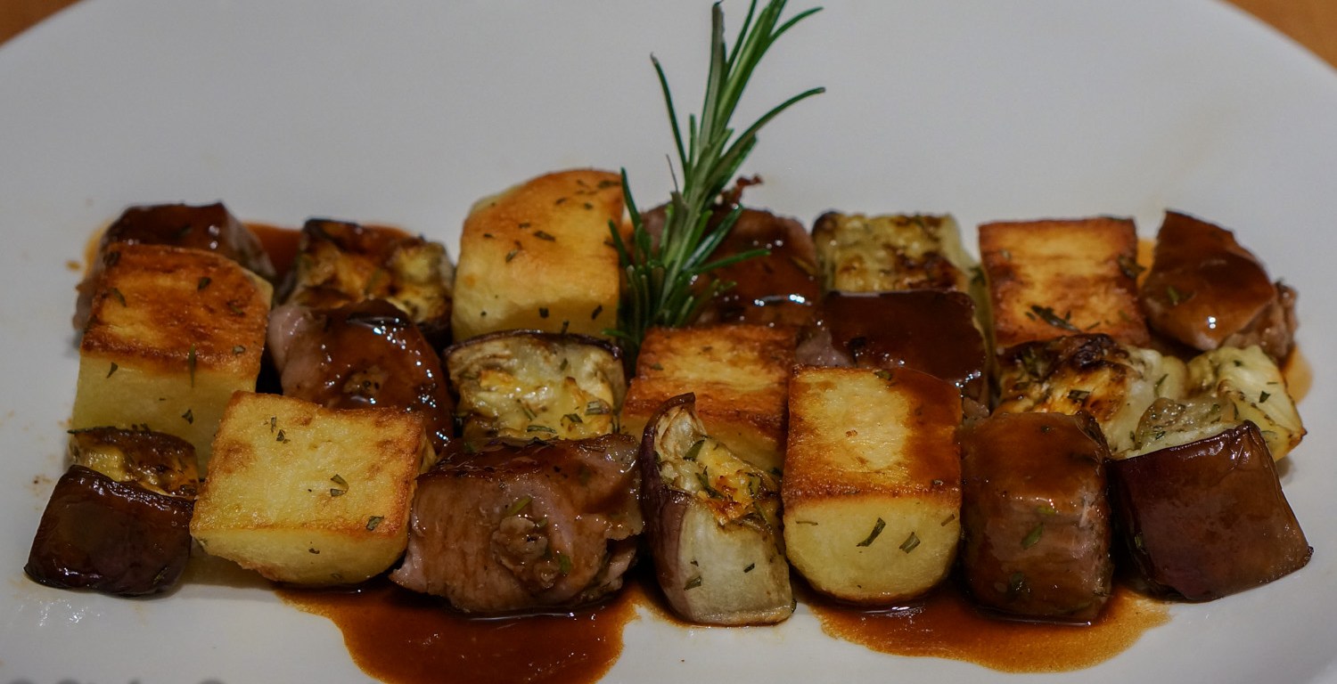 I used lamb loin fillet for the meat as it is the most tender party of the lamb. Pink eggplant as they are more tender than regular eggplant, but you could use regular eggplant as well. And a nice lamb demi-glace red wine sauce, created by reducing lamb stock. Rosemary is what brings it all together. I cooked the lamb sous-vide, but as the cubes are quite small you could simply brown them a bit longer and allow them to rest to be cooked to the core.