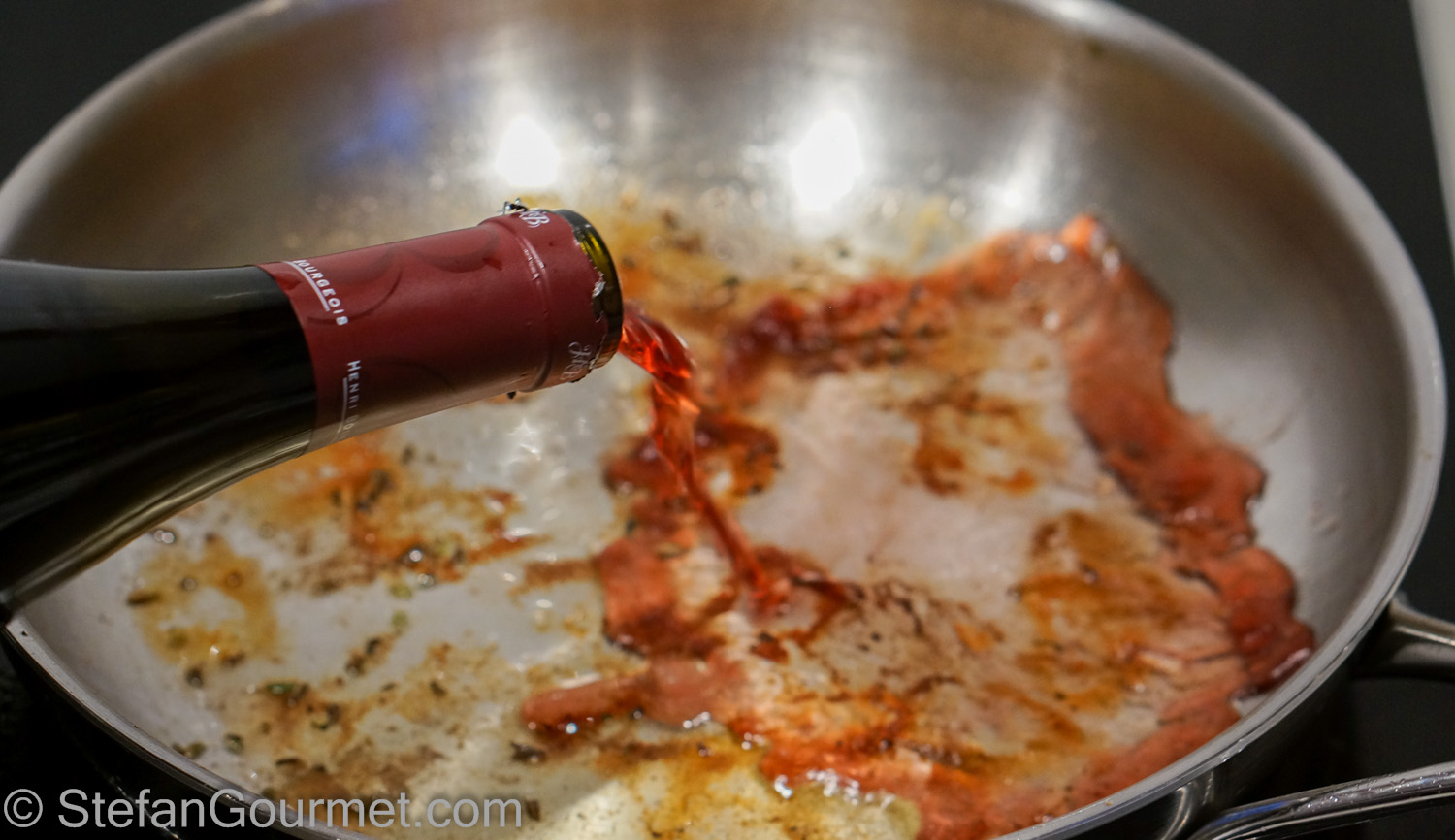Pour any excess fat from the pan and deglaze with red wine. Scrape the bottom of the pan with a wooden spatula to get all of the flavor from the browned bits into the sauce.