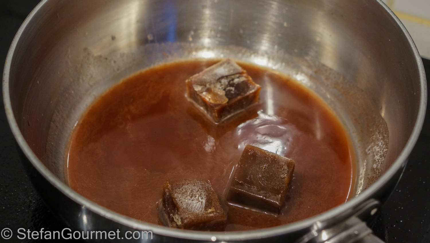 Sieve the red wine sauce and add the lamb demi-glace (which I keep in an ice cube tray in the freezer).