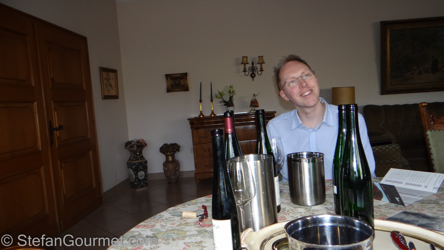Our next visit was Jos. Christoffel Jr., at walking distance. Like Karl Erbes, this is a family estate that has been around for centuries. Although some semi-dry wines are produced, most are sweet. Karl-Josef Christoffel told us that according to him a good Mosel riesling has no more than 7.5% alcohol. He prefers sweet wines and actually grimaced when he tasted his own halbtrocken and feinherb wines. Again there were a lot of wines available for sale and to be tasted, about 60. Here the wine tasting was in the living room of the beautiful old house. All the wines are from Ürziger Würzgarten and Erdener Prälat, and also here old wines are for sale as well (as far back as 1994).
