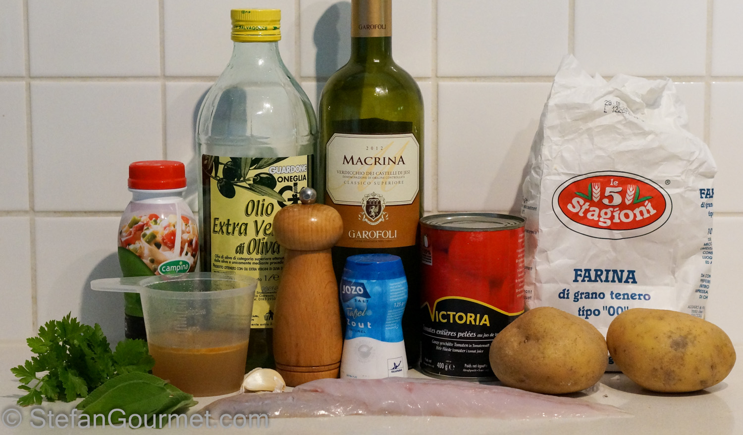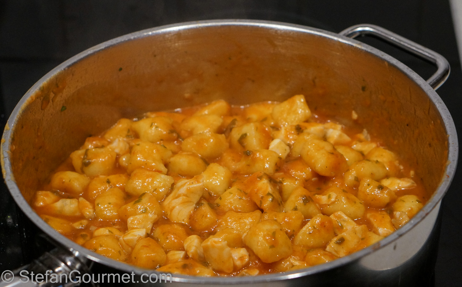 After eating at three-star restaurants and trying complicated recipes, it’s easy to forget that simple food can be great, too. Fortunately I only need to browse one of Biba Caggiano’s cookbooks to be reminded of that, and that is where I found this recipe. You may not think that making your own gnocchi from scratch is simple food, but it is for many Italian home cooks. Of course you could use store-bought potato gnocchi to make this recipe instead, but fresh homemade gnocchi are much more delicate and a great match for this lovely fish sauce. The combination of seafood, tomatoes, and potatoes is a classic in Italian cooking and for good reason because it is very tasty.