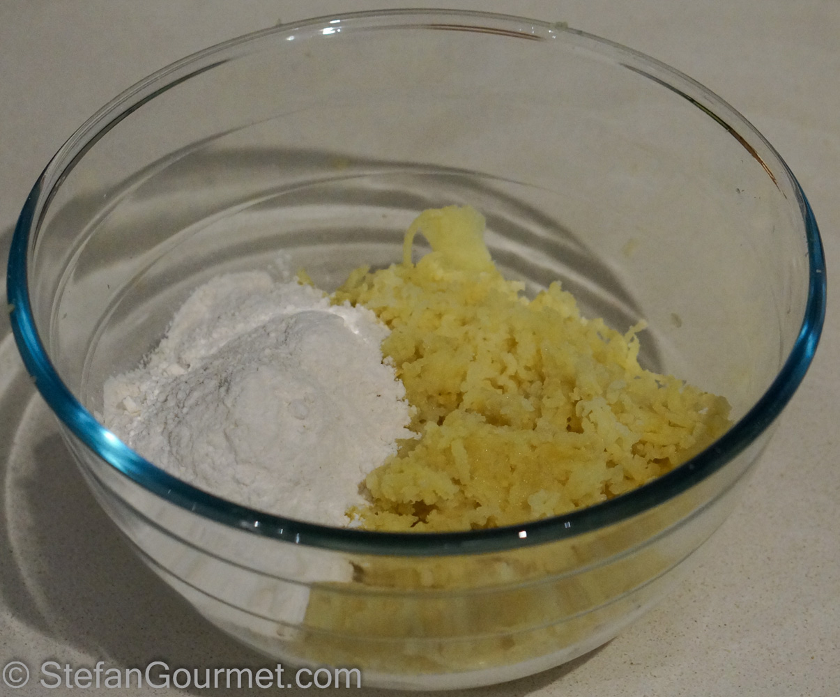I love baking the potatoes on a bed of salt. It wicks even more moisture out and requires less eggs later on. A trick and recipe I learned from Paul Wolfert.