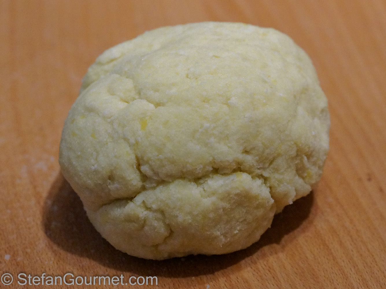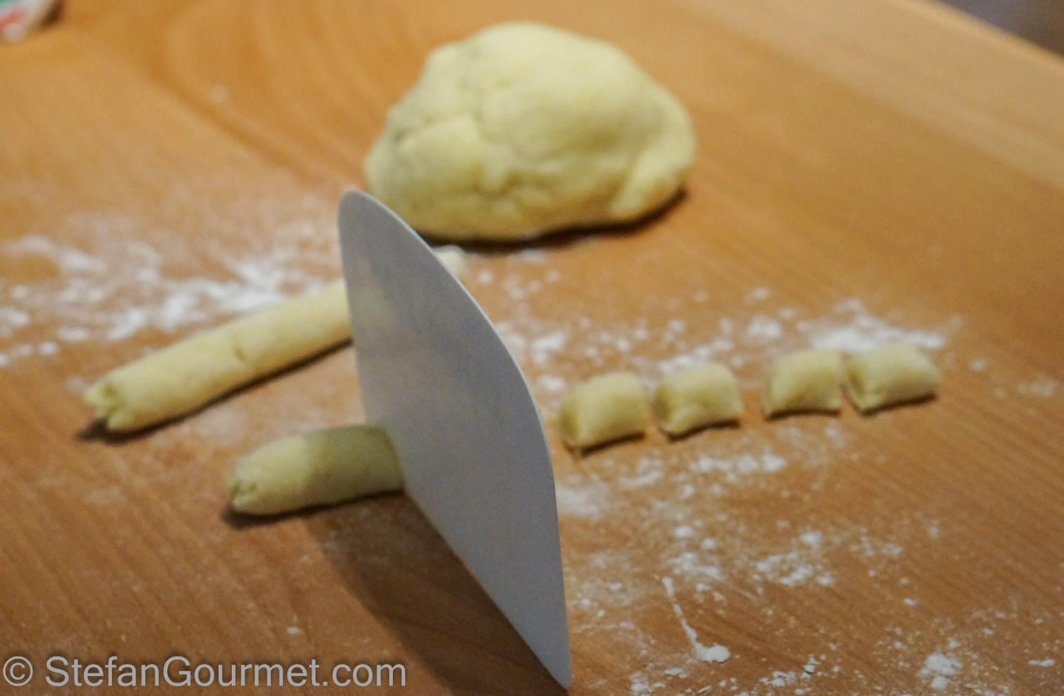 Dust your work surface (wooden is best) with flour. Take a piece of dough, roll it into a thin sausage about the thickness of a finger, and cut it into gnocchi.
