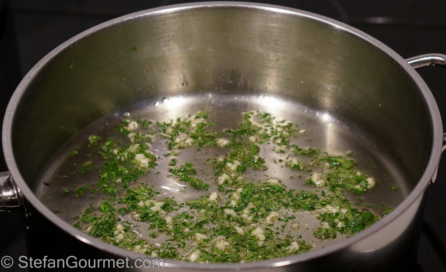 Heat the olive oil in a frying pan. Add the garlic, parsley, and sage, and stir for a minute over medium heat.