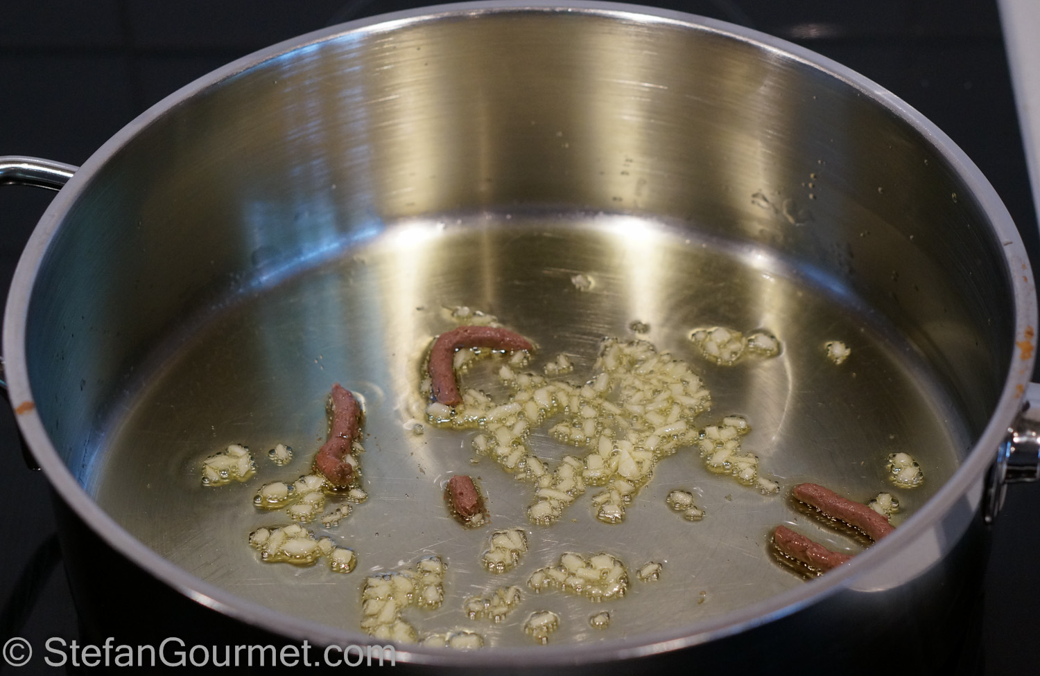 Heat the olive oil in a frying pan over medium heat. Add the garlic and anchovies and stir for a minute. Do not let the garlic color.