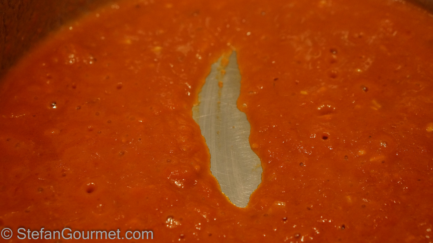 The tomato sauce is done when it no longer ‘leaks’ water when you stir a ‘hole’ in it.