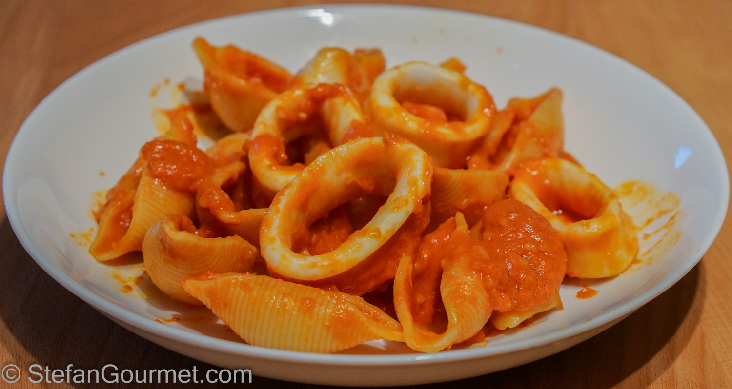 Sorry to sound like a greedy baby, but oh yum!!!! Now this is entirely ‘my’ kind of soulfood as I could not see myself tired of squid, cuttlefish or octopus ever 🙂 ! And my Friday delivery had conchiglie from a very good firm enclosed! Now to get the squid!! And I would not have thought of anchovies . . .