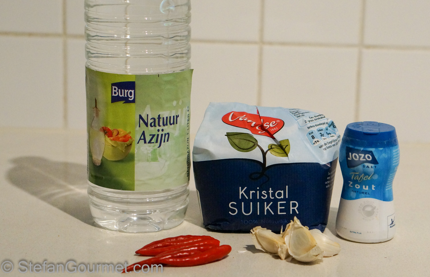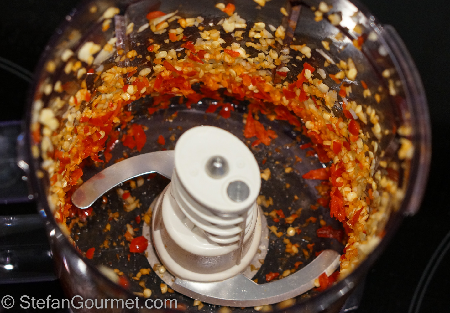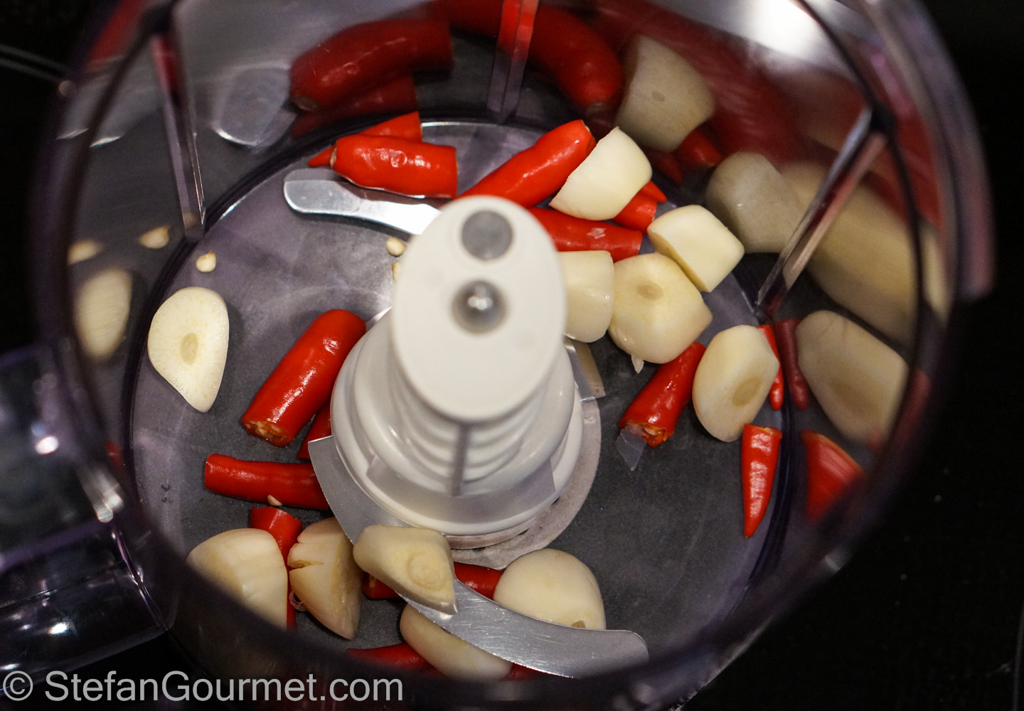 To make the sweet chilli sauce, roughly chop the chile peppers and the garlic and put in the food processor.