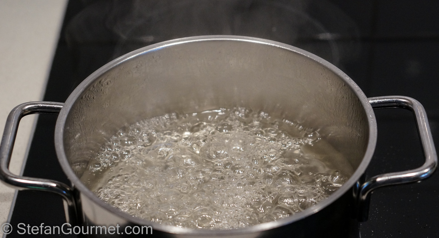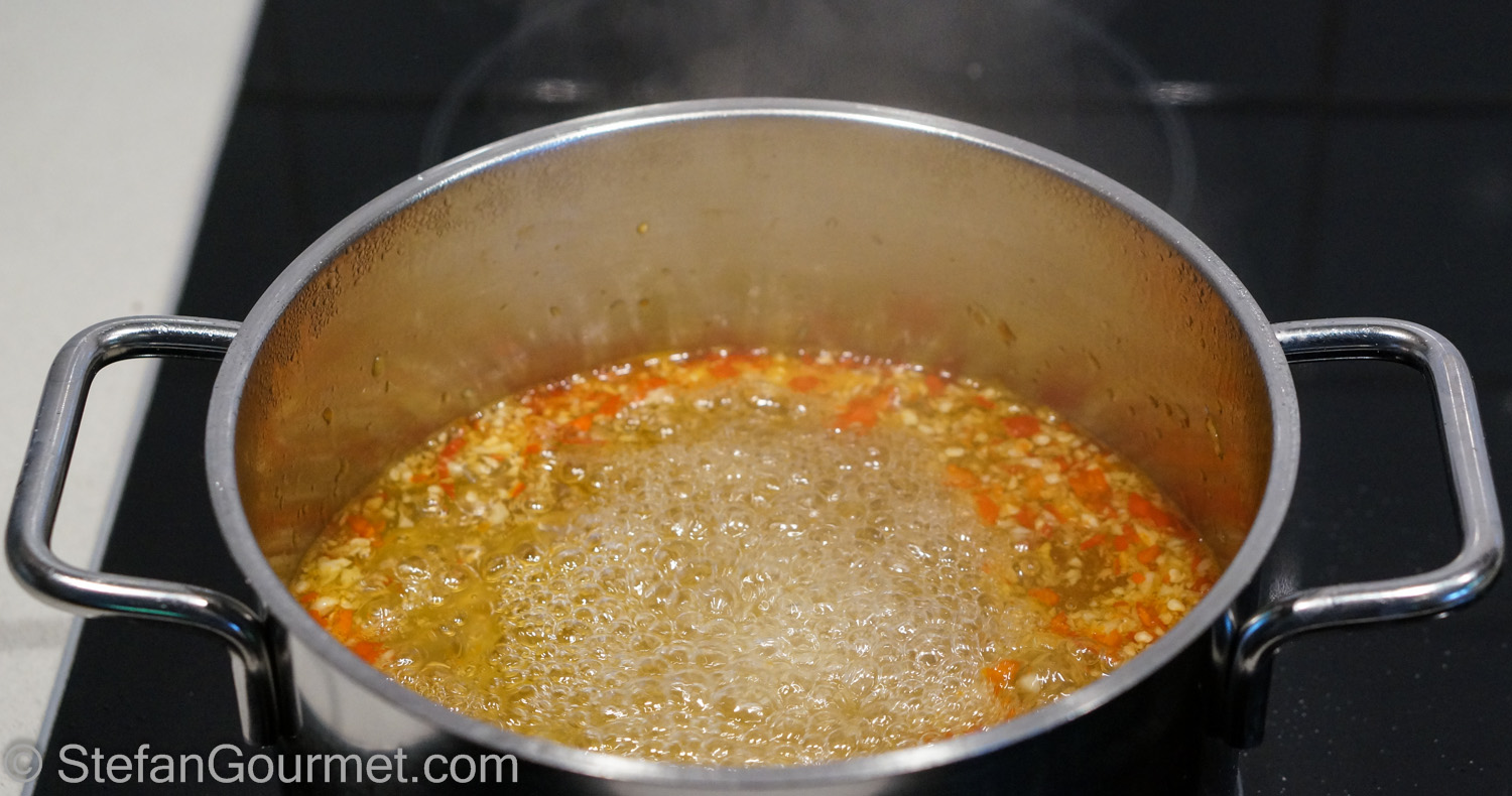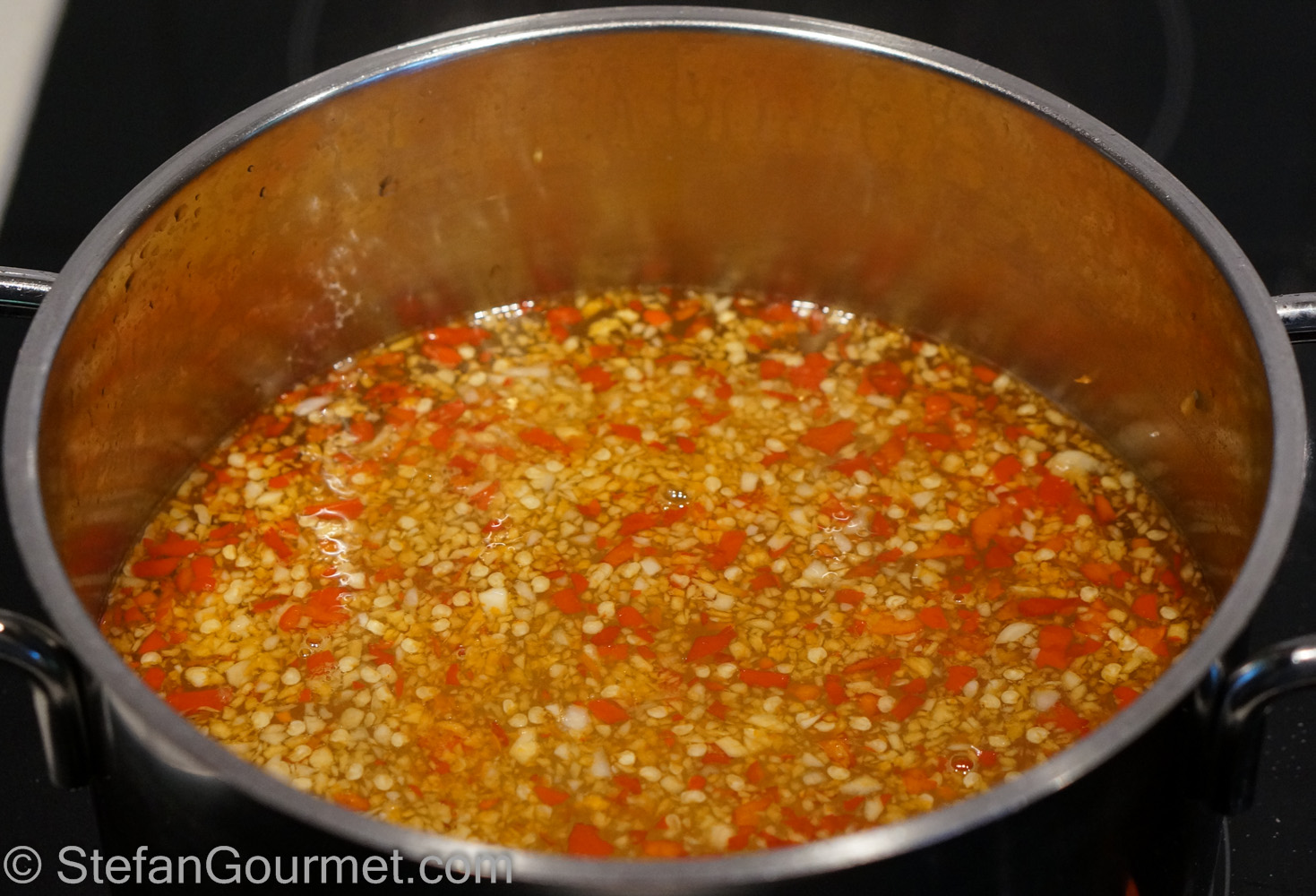 …and bring to a boil again. Allow to boil for 2 minutes, then turn off the heat and allow to cool to room temperature. Add the crushed peanuts.