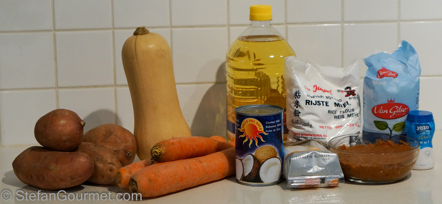 Lately I’ve been trying more and more Thai food, using recipes from The High Heel Gourmet. Kees is working on the boat and I promised to prepare dinner for the workers. It was unseasonably cold, so I decided it had to be comfort food. Then I read about Gra Bong Tod on Miranti’s blog, and I knew at once that it would be great for this occasion. Gra Bong Tod is Northern Thai Style Tempura, shredded vegetables deep fried with a batter of coconut milk, shredded coconut, red curry paste, and rice flour. It is street food and therefore perfect for preparing outside on the boat.
