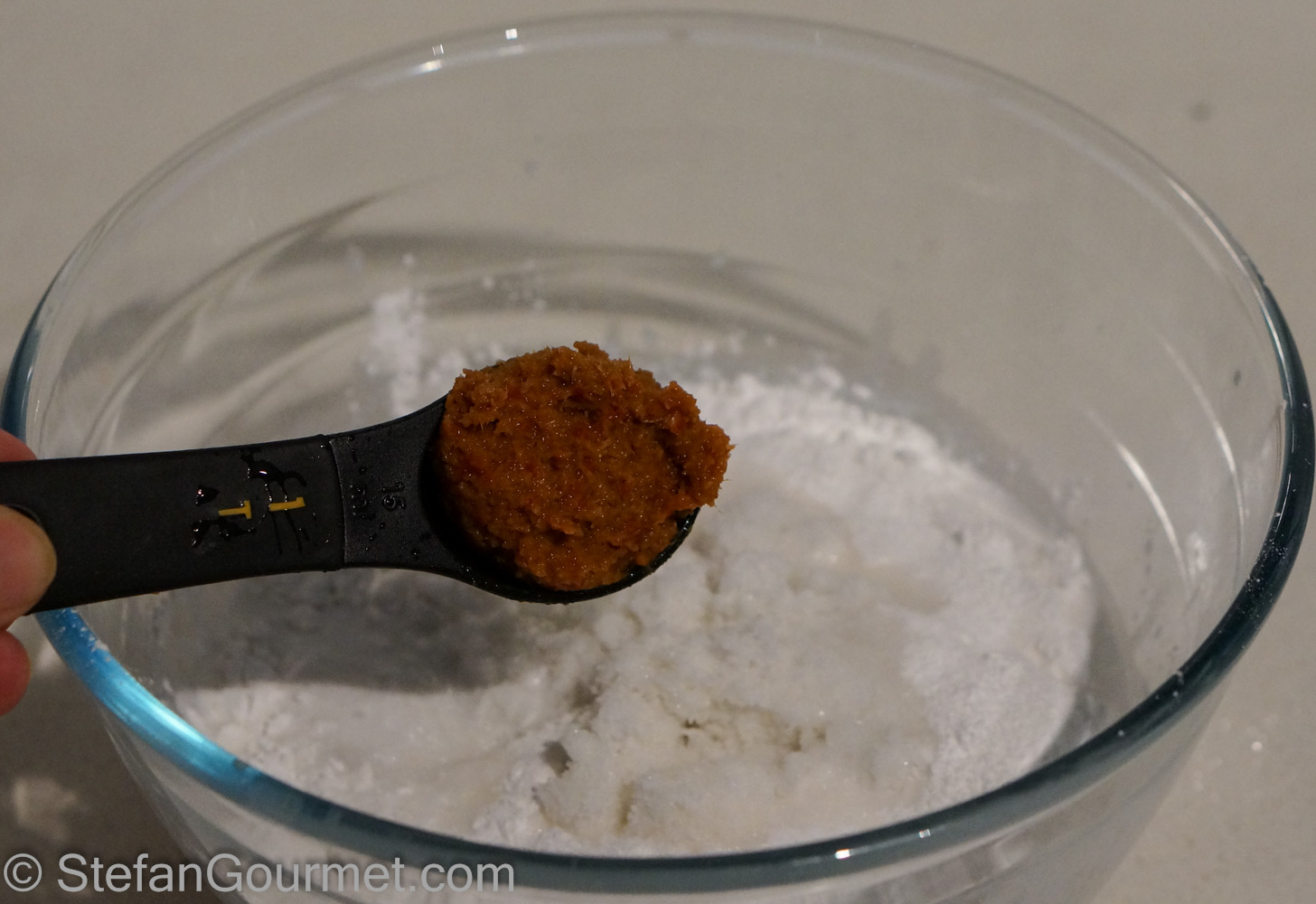 Drain the soaked coconut and put it in a bowl. Add the rice flour, coconut milk, salt, sugar, and red curry paste.