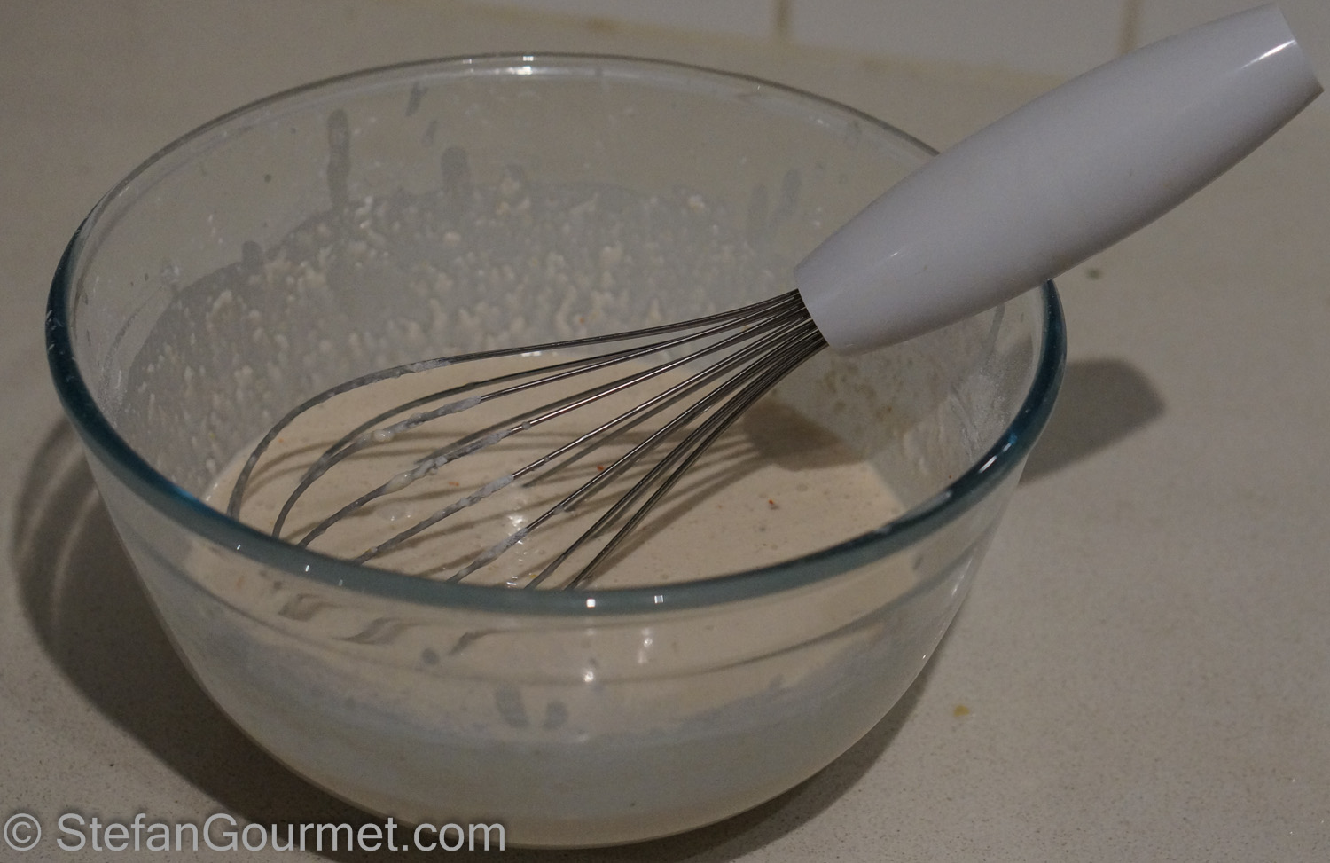 Whish to mix. The batter should be quite thick. If it is too thin, add more rice flour. If it is too thick, add more coconut milk. Mix the batter with the vegetables.