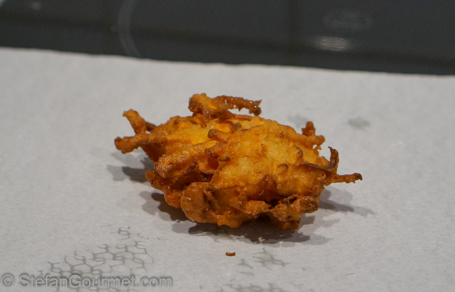 I also tried shrimp, which was very tasty as well. The sweet potato was the best of the veggies. The carrot released a bit too much water, which made the fritters fall apart. The batter needs to be quite thick and you need enough batter for the fritters to hold together.