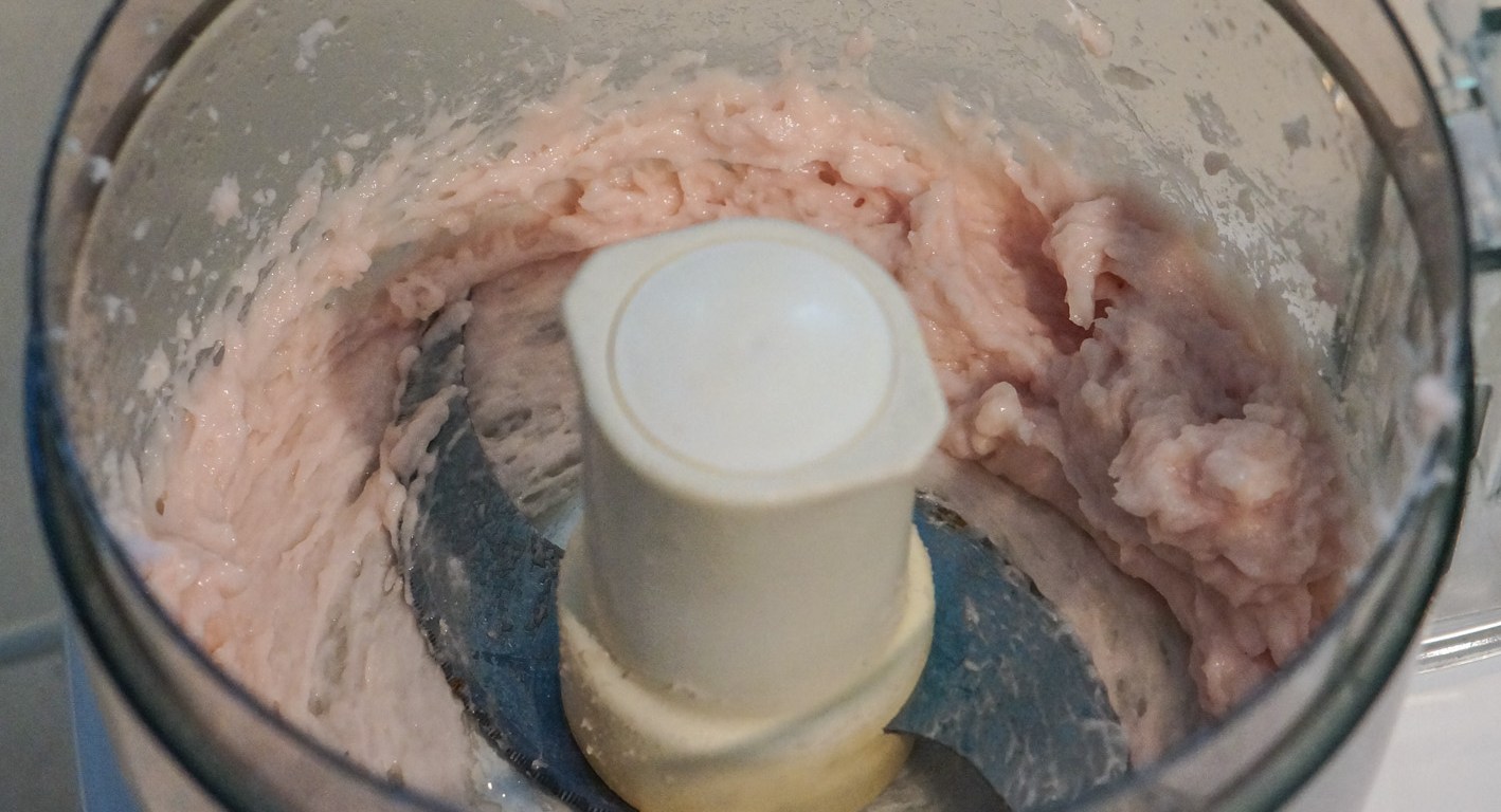 Put the trout fillet in a food processor and add 2 Tbsp of cold water and 1/2 tsp of salt for every 500 grams (1.1 lbs) of trout fillet.