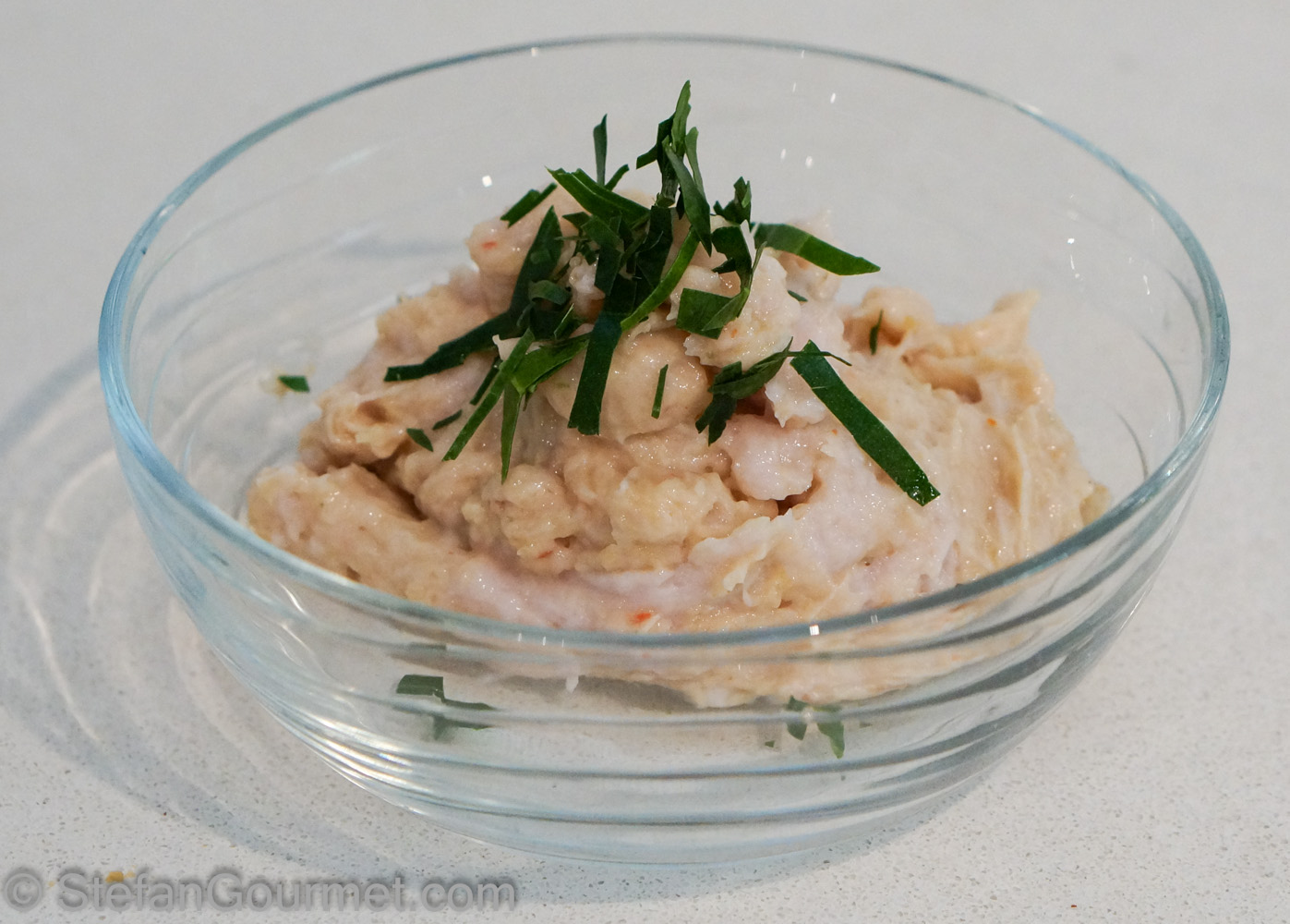 Process until it becomes like a stiff mousse. You may need to add a bit more water and salt and process a bit longer. With the magimix food processor (which has a strong motor and a high speed) the trout turned into fish paste very easily. This actually was a lot easier than I feared after reading Miranti’s instructions.
