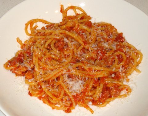 A very appropriate flashback today: Spaghetti all’Amatriciana, or spaghetti with a sauce of tomatoes, guanciale (or pancetta), dried hot chile pepper, and garlic.