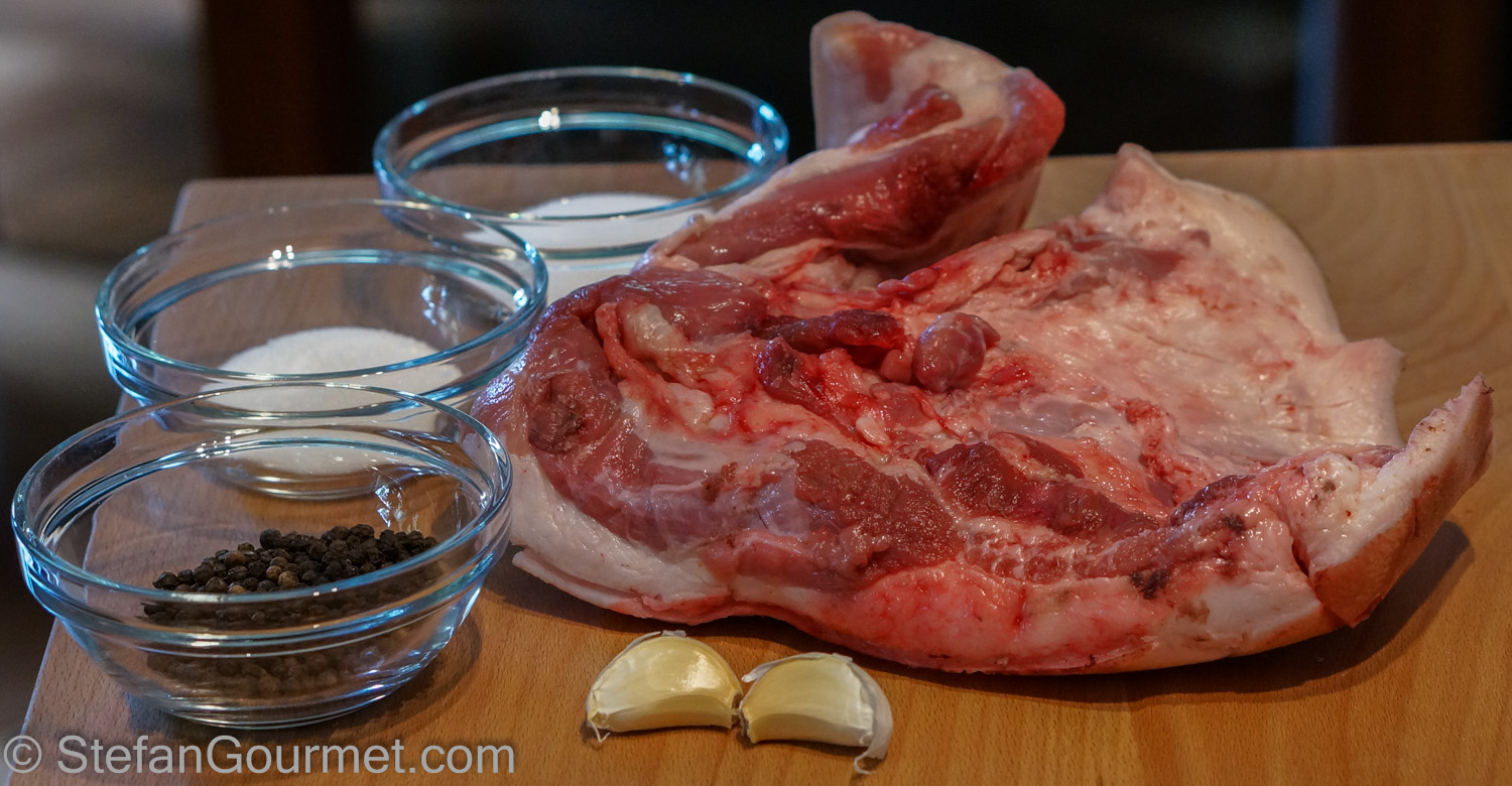 Guanciale is cured pork jowl. It is the traditional ingredient for Spaghetti alla Carbonara, Amatriciana and Gricia, but difficult to find outside of Italy. Pancetta (cured pork belly instead of jowl) can be used as a substitute, but of course it is nicer to use the real thing. After the success with making my own homemade pancetta, I also wanted to try making my own guanciale. Pork jowl is not as easy to find as pork belly, but luckily my butcher was willing to sell me some.